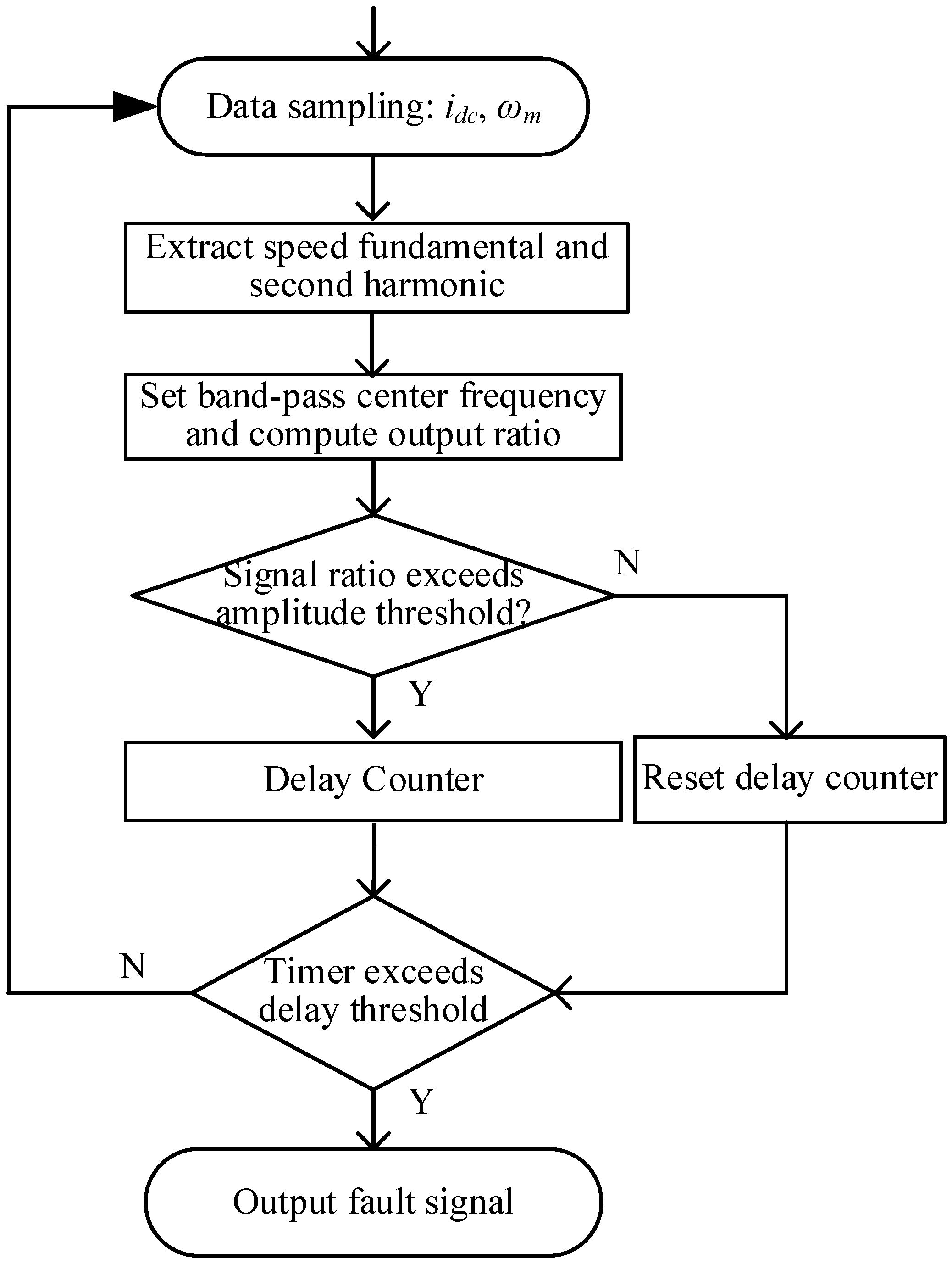 Figure 4. The monitoring circuit first provides the DC link current reference and motor speed signals. Next, the amplitudes of the DC current component and its second harmonic are extracted and compared, and their ratio is used as the fault detection index for identifying inter-turn winding short circuits. At this stage, the center frequency of the band-pass filter is adaptively adjusted according to the rotor speed provided by the FOC controller. The quality factor of the filter is kept constant and is set to 3 based on engineering experience. It is noteworthy that, considering the transient inrush current during motor startup and the system noise during operation, a time threshold is incorporated into the proposed detection flow in practical applications. In this case, the program outputs a fault signal for the stator windings only when both the magnitude and duration of the signal variation exceed the permissible limits. With its high sensitivity and capability for continuous data acquisition, the proposed programmable architecture ensures timely and adaptive responses to varying fault conditions within the drive system.