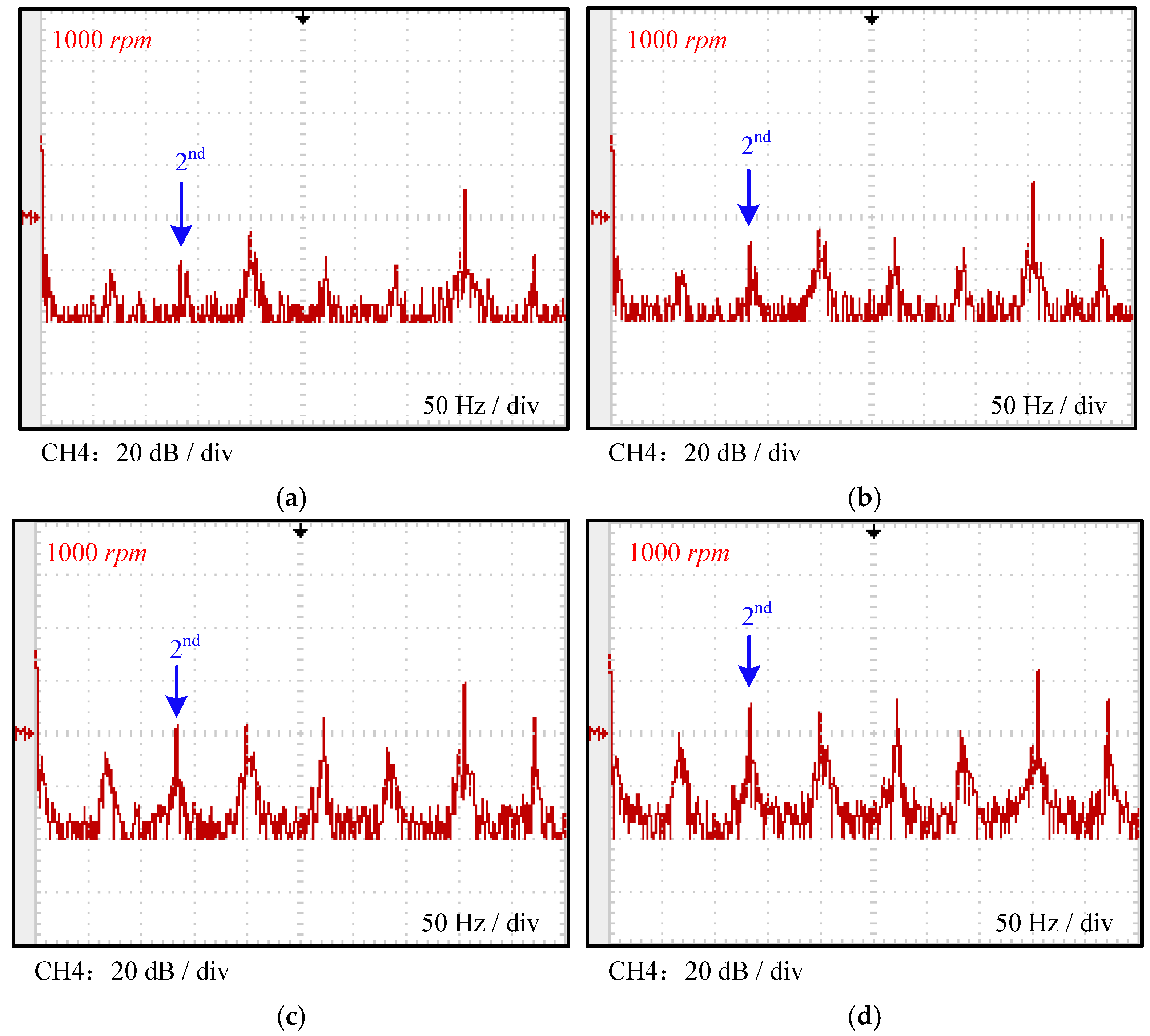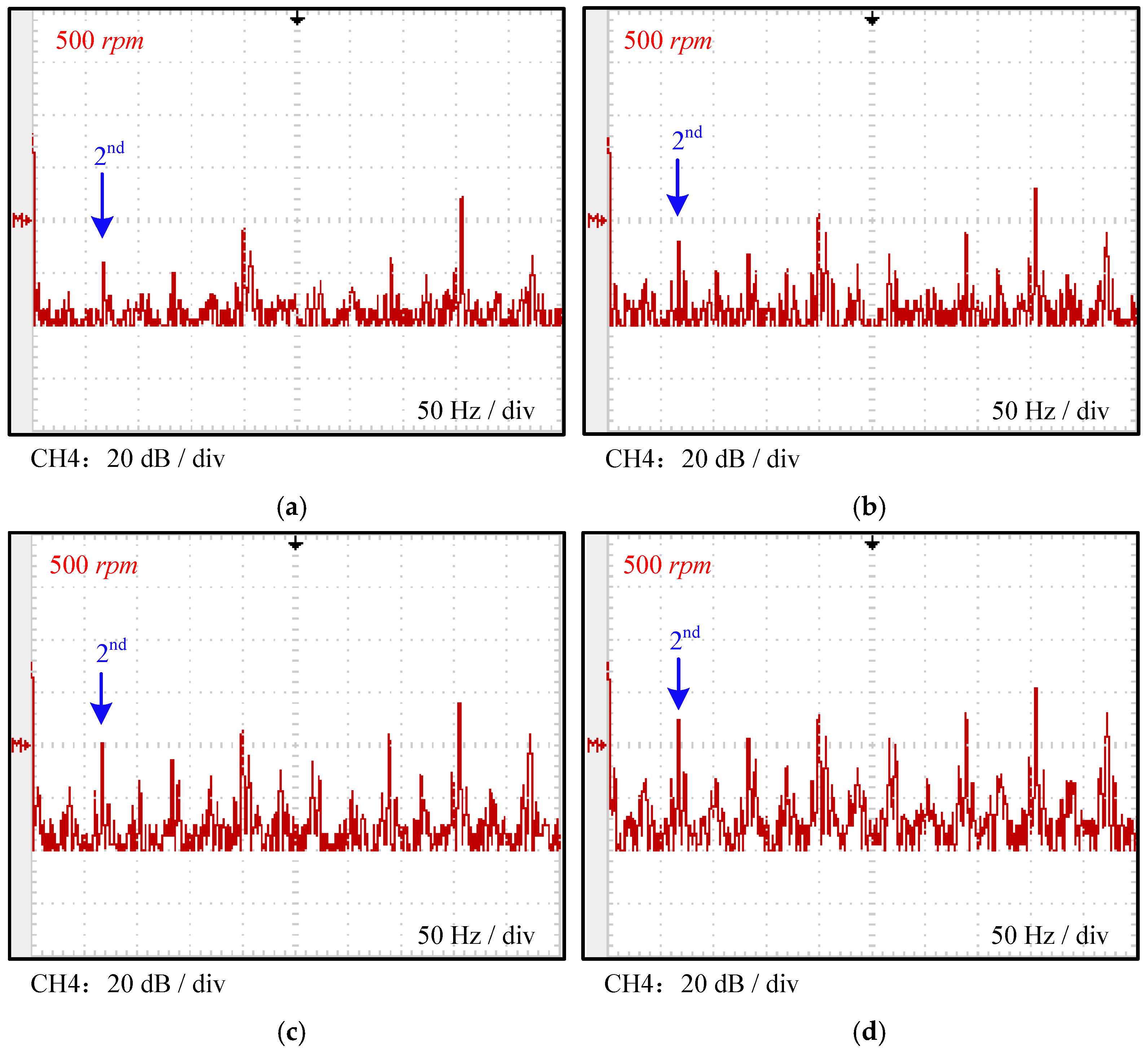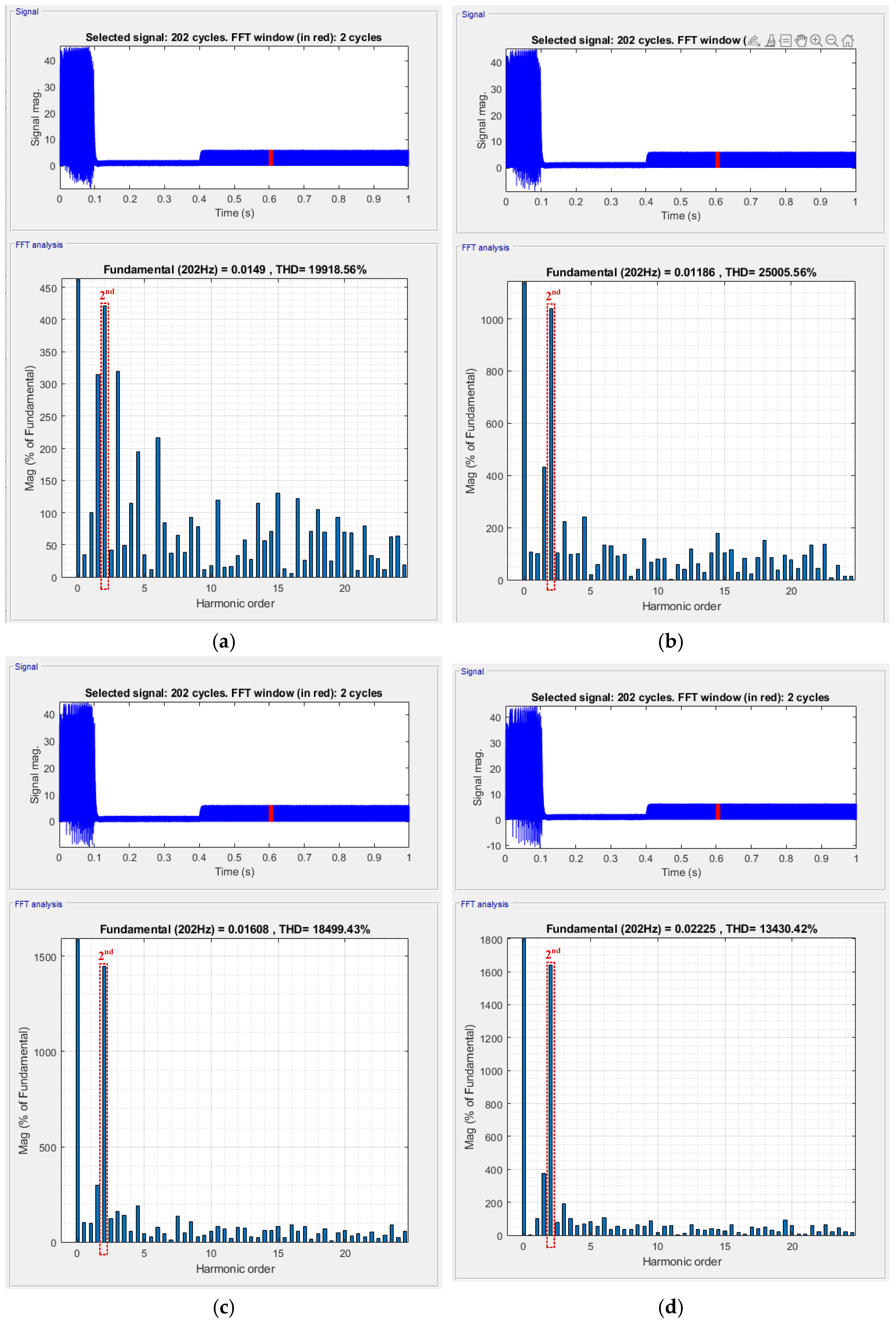 Figure 11 present the corresponding Fourier frequency-domain analysis results obtained automatically by the oscilloscope. Since the tested motor is an 8-pole machine, the ideal electrical frequency at 500 rpm is 200 Hz. From