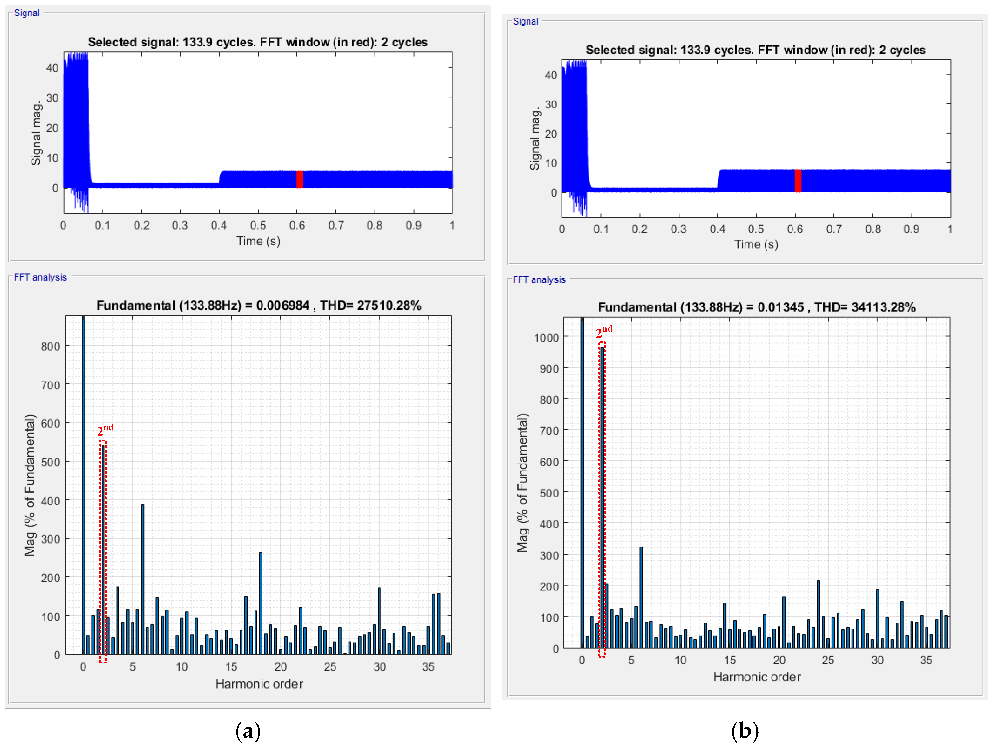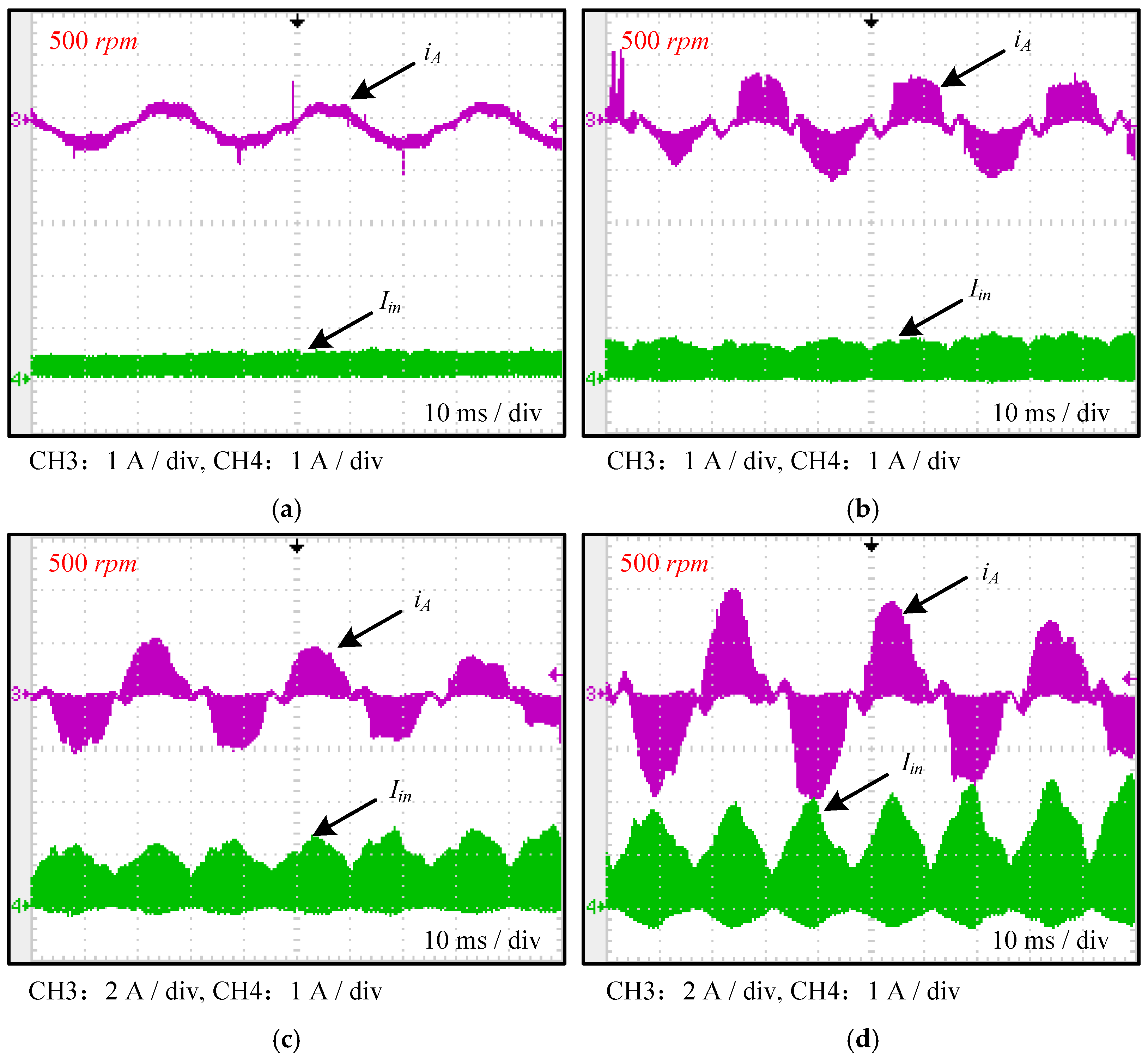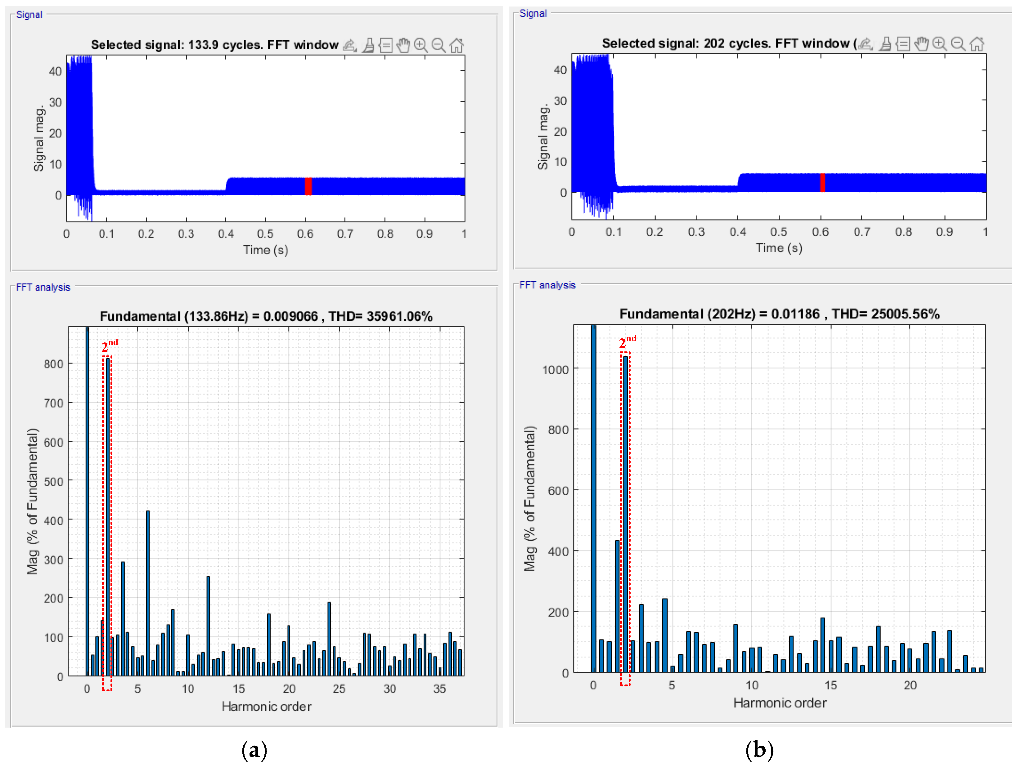 Figure 11 present the corresponding Fourier frequency-domain analysis results obtained automatically by the oscilloscope. Since the tested motor is an 8-pole machine, the ideal electrical frequency at 500 rpm is 200 Hz. From