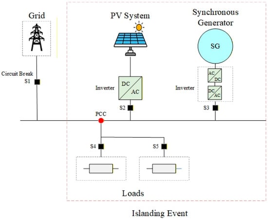 An islanding event is defined as a phenomenon when the main grid is disconnected from the inverter-based resources, while the connected inverters continue to deliver the power to the loads. As shown in Figure 1, the islanding occurs when circuit break S1 is open while the PV system and synchronous generator keep feeding the load with the required power via the point of common coupling (PCC). Islanding events are categorized as intentional and unintentional islanding events. Intentional islanding is a managed condition that is applied to allow some sections of the power grid to work individually during major faults, stopping blackouts and sustaining critical loads. But unintentional islanding happens when the connected inverters become isolated from the main grid due to disturbances or disconnections such as short circuits. Unintentional islanding has to be detected rapidly and accurately within less than 2 s according to IEEE 1547-2003 standards [14] this event can cause risky consequences to the network, such as losing the voltage and frequency control and endangering personnel and equipment, especially when the local generation and load are tightly matched.