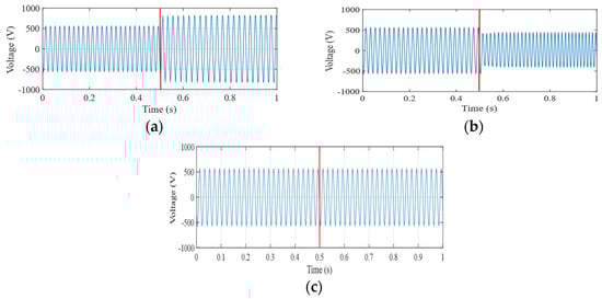 The islanding occurs exactly at 0.5 s, as highlighted by the red vertical, line under different scenarios, as presented in parts (a) and (b) of Figure 2, where there is no match between the inverter power and load demand. In these cases, it is very easy to detect the islanding due to the significant voltage level deviation, either over or under voltage. While in part (c) the inverter power matches the demand, resulting in a steady voltage level even after islanding. This condition is known as NDZ and makes it more complex to detect the islanding within the allowed time.