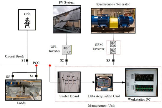 In this work, a low-voltage AC microgrid-connected system was utilized for carrying out the experiment. The microgrid-connected system consists of a utility power supply, a 3.2 kW grid-following inverter (PV system), a 20 kW grid-forming inverter (synchronous generator system), a measurement unit, and 1.5 kW linear (resistive) and non-linear loads, as presented in Figure 5.