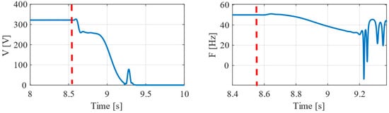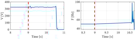 In the third case, both GFL and GFM inverters are connected to the grid system simultaneously, establishing a multi-inverter system. Similarly, both voltage and frequency amplitudes are captured pre- and post- the unintentional islanding event, as shown in Figure 8. In this case, as islanding starts at 9.15 s, highlighted by the dashed red line, the GFM inverter dominates the system and maintains significant stable voltage and frequency, which greatly enlarges the NDZ. As a result, the system needs 12.72 s to shut down, which is far longer than the standard acceptable detection time which leads to serious risky consequences if not appropriately and accurately addressed.