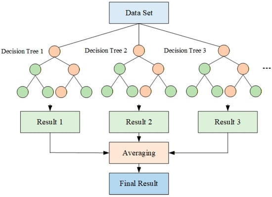 Accordingly, an islanding detection method based on the Random Forest (RF) approach is proposed and compared with the inverters used in our work. RF is a supervised machine learning method that builds various decision trees during the training process and harvests the classification mode and the prediction mean of each tree, as presented in Figure 9. RF has many significant advantages, such as the ability to decrease overfitting, built-in feature importance measurement, and high prediction accuracy [38,39].
