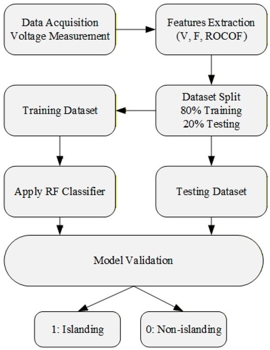 In this work, the RF model was designed to accomplish a binary classification of 0 or 1 for non-islanding and islanding, respectively, using three input features: voltage amplitude, voltage frequency, and rate of change in frequency (ROCOF). The dataset consists of 33,865 samples gathered from the experimental measurements and had been split utilizing an 80/20 hold-out technique applied with MATLAB’s cvpartition, providing 27,092 samples for training and 6773 samples for testing, as shown in Figure 10. The model was developed using the TreeBagger function with 100 decision trees. Every tree was trained using a bootstrap-resampled subset of the training data and grew to its greatest depth without trimming. Random feature selection was employed at each node to establish the appropriate split, hence improving ensemble diversity. Out-of-bag (OOB) prediction was enabled to offer an internal assessment of the model’s generalization error irrespective of the test data set. Training and prediction were subsequently performed on the different subgroups to create the final model utilized in assessment.