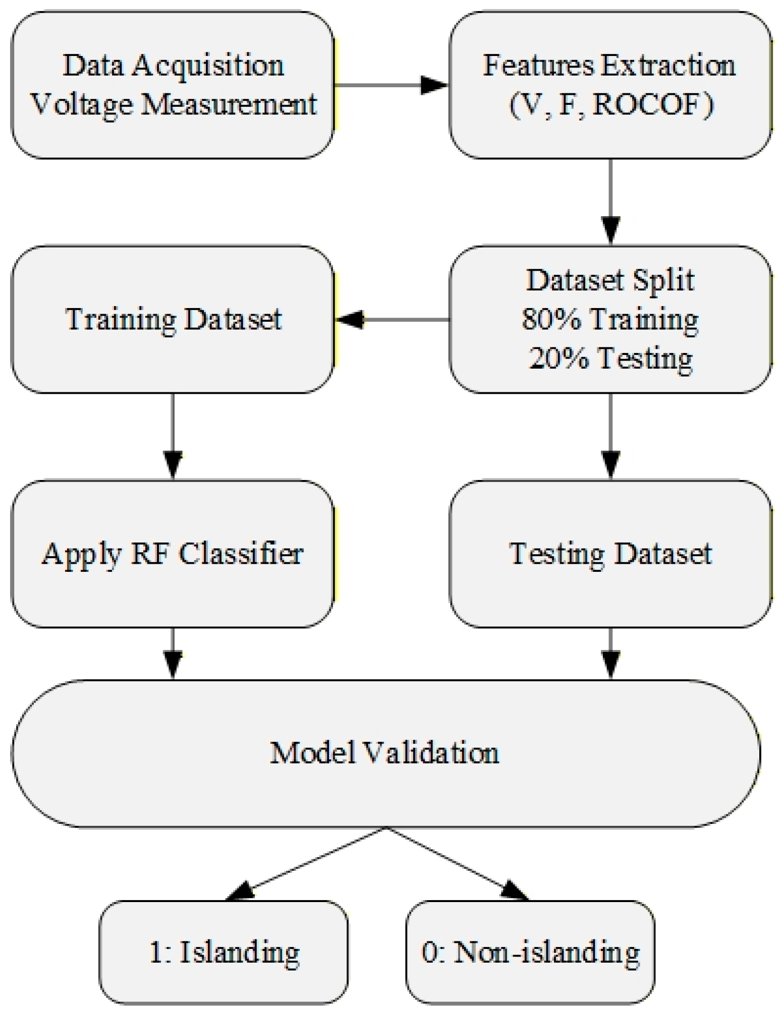 - A Random Forest-based technique for reliable and quick islanding detection using voltage, frequency, and ROCOF, accomplishing 99.29% accuracy and 0.2 s prediction time.