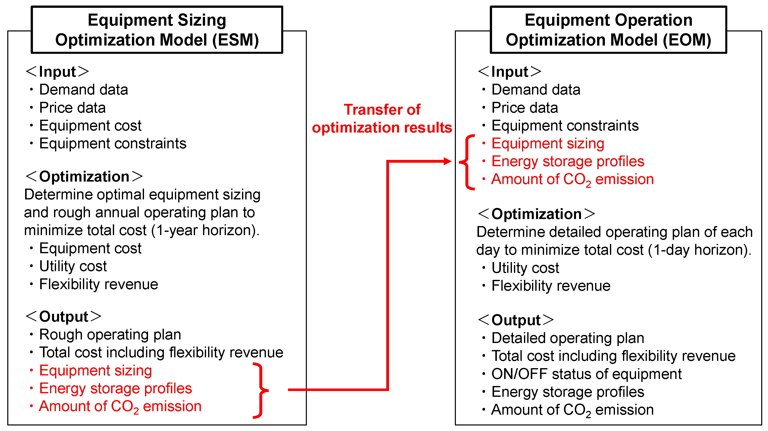 - In the ESM, the partial-load efficiency characteristics of equipment such as gas engines and absorption chillers are represented using linear approximations formulated as a linear programming (LP) model without integer variables by omitting startup and shutdown states. This simplification reduces computational complexity and enables efficient equipment sizing. In contrast, the EOM incorporates these operational details through a full MILP formulation, allowing more accurate representation of equipment behavior in detailed scheduling.