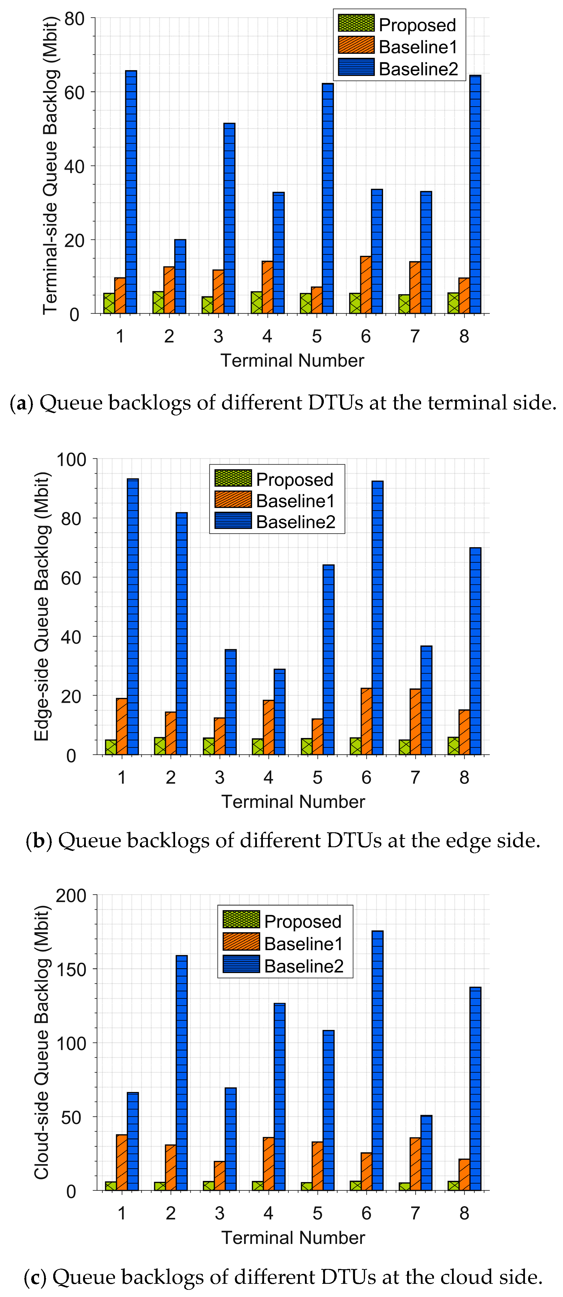 Figure 5 illustrates queue backlogs of different DTUs at time slot 400. The figure indicates that, compared with Baseline 1 and Baseline 2, the proposed algorithm achieves the most stable queue backlog. As indicated by the results in