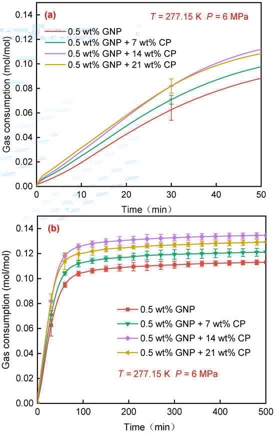 The tind, t90, gas consumption, and gas storage capacity gained from the experiments are listed in Table 1. Figure 1 displays the effects of CP concentration on CH4 consumption in GNP + CP nanofluids. As seen in Figure 1a, during the initial 20 min, an increased CP concentration led to a faster reaction rate and greater gas consumption. This can be attributed to the fact that elevated CP concentrations lead to the formation of more CP hydrates within the GNP nanofluid, thereby facilitating the entry of CH4 into the pre-formed hydrate cage structures. At the same time, the increased amount of CP can aid in transferring more CH4 molecules into solution for subsequent incorporation with water. As the experiment progressed, gas consumption in the 0.5 wt% GNP + 14 wt% CP system surpassed the 0.5 wt% GNP + 21 wt% CP system after approximately 30 min, showing the enhanced formation kinetics. Finally, as depicted in Figure 1b, gas consumption in 0.5 wt% GNP + 14 wt% CP system was 4.2% higher than that of the 0.5 wt% GNP + 21 wt% CP system. This mainly resulted from the increased mass transfer impedance during hydrate generation in the 0.5 wt% GNP + 21 wt% CP system, resulting in a smaller cage occupancy of CH4 compared with that of the 0.5 wt% GNP + 14 wt% CP system.