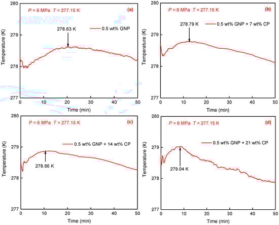 Figure 2 shows temperature variations over CH4 hydrate generation at varied CP concentrations. As presented in Figure 2a, in the 0.5 wt% GNP nanofluid without CP, a temperature peak appeared at 20.8 min and it reached the maximum value of 278.63 K, indicated by black arrows. This suggests the substantial and continuous hydrate generation during this period [52]. When adding a certain amount of CP into the GNP nanofluid, as exhibited in Figure 2b–d, the temperature peak reached 278.79 K, 278.86 K, and 279.04 K, corresponding to 7 wt%, 14 wt%, and 21 wt% CP, respectively, higher than that in the 0.5 wt% GNP nanofluid without CP. This indicates greater hydrate formation with increased CP concentration. It is also found that a higher CP concentration resulted in a shorter time to reach the maximum temperature of the exothermic peak. For example, the time obtained at 0, 7 wt%, 14 wt%, and 21 wt% CP was 20.8 min, 13.0 min, 10.2 min, and 8.5 min, respectively, indicating that higher CP concentrations can facilitate faster hydrate formation during the initial phase.