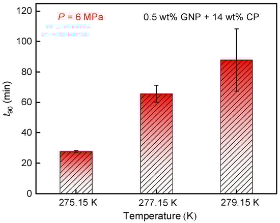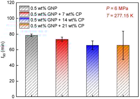 Impacts of CP concentration on t90. Experiments were conducted at 277.15 K and 6.0 MPa.