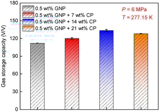 Effects of CP concentration on gas storage capacity. The experiments were conducted at 277.15 K and 6.0 MPa.