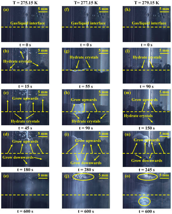 Figure 9 shows the morphological behavior during CH4 hydrate generation in a 0.5 wt% GNP + 14 wt% CP system under varied temperatures. Note that the kinetic behavior of CH4 hydrate formation can be elucidated by observing the hydrate growth morphology without using any image analysis metrics [27,46]. Although quantitative image analysis was not performed, the visual comparison clearly indicated that hydrate coverage became more extensive and the crystal density was higher at 275.15 K, consistent with the kinetic data, showing a faster growth and higher gas consumption. Figure 9a,f,k show the beginning of the experiments. It is clear to see that hydrate initially formed at gas/liquid interface because of the extensive contact area, as illustrated in Figure 9b,g,l. At 275.15 K, hydrate crystals appeared at 15 s, while they first appeared at 90 s as the temperature increased to 279.15 K. This means the lower the temperature, the shorter the hydrate induction time. Note that hydrate initially grew upward along the reactor wall, and a small amount of hydrate crystals grew downwards at the same time, as shown in Figure 9c,h,m. As the reaction progressed, the hydrate continued to grow both upward and downward. It was found that lower temperatures resulted in faster hydrate growth, as exhibited in Figure 9d,i,n. Finally, at 600 s, the hydrate nearly covered the reactor wall. However, the hydrate formed at 275.15 K was found to be denser, leaving no additional voids in the reactor. In contrast, the hydrate formed at 277.15 K and 279.15 K did not fully cover the reactor wall, as indicated in the yellow circles in Figure 9j,o. This indicates less hydrate generation at these two temperatures compared to that at 275.15 K. The analysis of the morphological behavior of hydrate generation at varied temperatures revealed that lower temperatures significantly enhanced crystallization kinetics and promoted hydrate growth. These morphological observations are consistent with the kinetic experimental results shown in Figure 6.