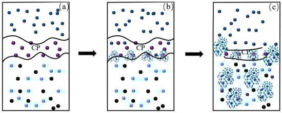 According to the revealed evolution patterns and kinetic mechanisms of hydrate formation, Figure 10 elucidates the mechanism of CH4 hydrate generation in the GNP + CP system. Figure 10a illustrates the initial state of the GNP + CP system, where the CP phase, being both buoyant and water-immiscible, floated on top of the aqueous nanofluid. Figure 10b depicts the onset of the reaction, where CH4 molecules diffuse through the CP phase and come into contact with water, leading to hydrate generation at the CP/nanofluid interface. CP molecules quickly occupied the 51264 cavities of the hydrates (the large cage consists of 12 pentagonal faces and 5 hexagonal faces, which is assembled from numerous water molecules with hydrogen bonds), while some CH4 molecules were confined within the 512 cavities. At this stage, sII hydrates were predominantly formed. Figure 10c illustrates the intermediate and later stages of hydrate formation. The initially formed sII hydrates caused a reduction in the CP phase, making it difficult to fully cover the CP-nanofluid interface. Subsequently, CH4 molecules were consumed to form sI hydrates with the remaining water until the reaction was complete. As a result, the sI and sII hydrates ultimately coexisted in the reactor.