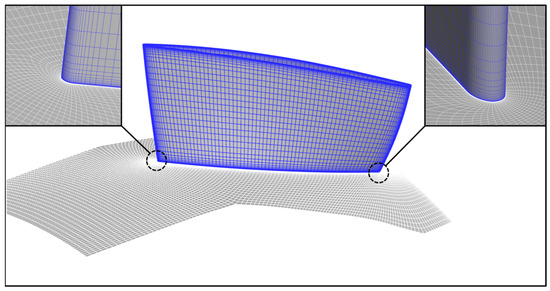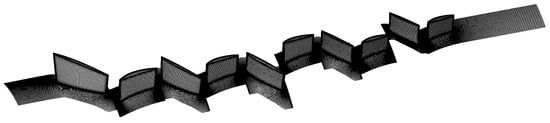 Based on the three-dimensional geometric model, the geometric coordinate file of the compressor was extracted, and structured mesh generation was performed using NUMECA (version 16.1) Autogrid (version 5) software. Figure 3 illustrates the mesh distribution of the first-stage rotor blade, with local refinement applied in the leading edge and trailing edge regions. The mesh topology adopts a H-O-H configuration: O-grids are arranged around the blade surfaces to accurately resolve boundary layer flow, while H-grids are applied to the inlet/outlet regions and rotational periodic surfaces for transitional meshing. Among the two-equation turbulence models, the k-ε model and the SST model are the most widely used. To more accurately simulate flow separation phenomena on the blade surface, the SST model was selected for the numerical simulations in this study [21]. As the SST model relies on the k-ω formulation in the near-wall region, a fine wall mesh is essential to ensure solution accuracy. In CFD engineering practice, a widely accepted guideline is to control the height of the first grid layer so that the dimensionless wall distance y+ is approximately 1, ensuring that the grid points reside within the viscous sublayer [22]. To satisfy this requirement, the height of the first grid layer adjacent to the wall was set to 1 × 10−6 m. Figure 4 illustrates the variation in total pressure ratio with the number of grid cells. When the total number of grid cells increases from 5.56 million to 6.30 million, the change in isentropic efficiency is less than 0.001. Therefore, the mesh with 5.56 million cells was selected.