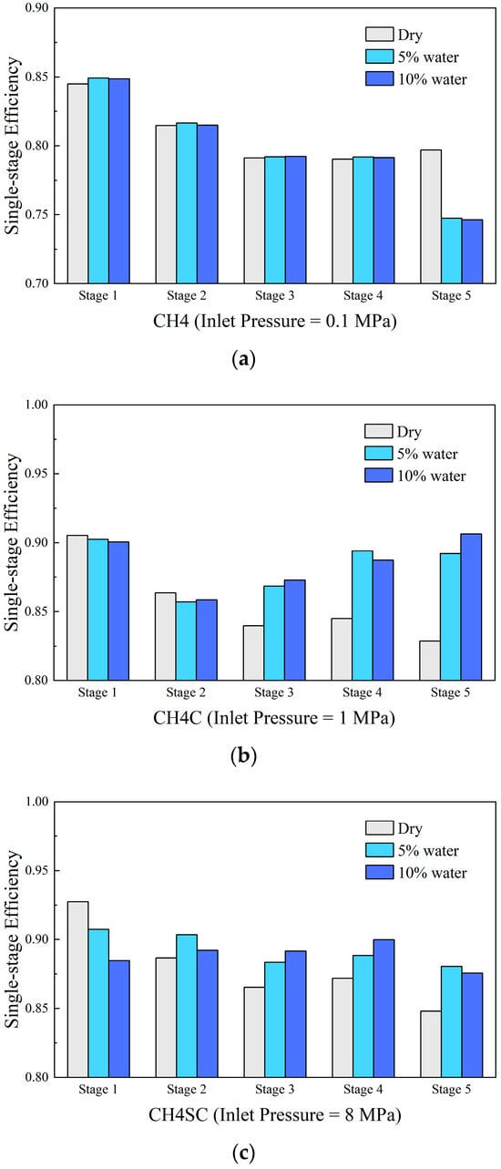 (1) Under low inlet pressure (0.1 MPa), the introduction of the liquid phase has a minor impact on the overall efficiency but leads to a marked decrease in last-stage efficiency. In contrast, at higher inlet pressures (1 MPa, 8 MPa), it results in a more substantial improvement in overall efficiency, with the stage efficiency distribution shifting toward a descending–ascending profile from front to rear stages.