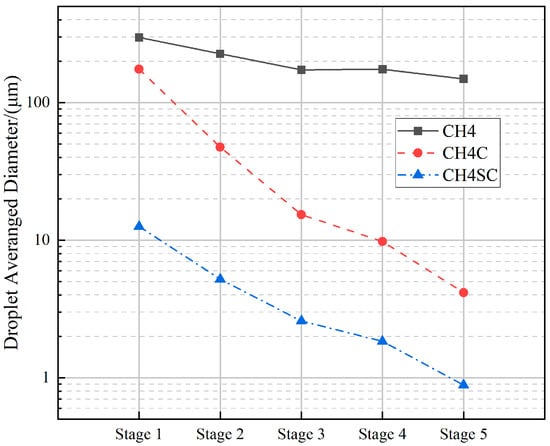 Figure 10 shows the variation curve of the average droplet diameter at the outlet of each stage under different inlet pressures at a 5% water flow rate. Under the same water flow rate, the average droplet diameter at the outlet of each stage decreases as the inlet pressure increases. According to Formula (6), after the inlet pressure increases, the droplet Weber number increases with the gas density, making droplets more prone to breakup. At the fifth-stage blade outlet, the average droplet diameter for the 1 MPa case is 2.81% of that for the 0.1 Mpa case, and the average droplet diameter for the 8 Mpa case is 0.59% of that for the 0.1 Mpa case.