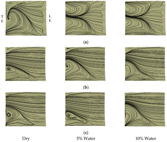 Limiting streamlines on the suction surface (Stator 5). (a) Case CH4; (b) Case CH4C; (c) Case CH4SC.