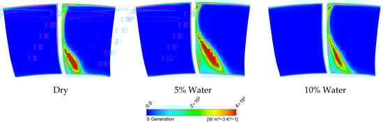 Figure 16, Figure 17 and Figure 18 present the entropy generation rate distributions in the trailing edge region of the fifth-stage stator under different operating conditions. The distribution characteristics show strong agreement with the previously discussed flow field analysis. At an inlet pressure of 0.1 MPa, the average droplet diameter within the flow passage remains large (>100 μm), making the cooling effect from droplet evaporation and heat transfer negligible. In this case, droplets only negatively impact compressor performance through aerodynamic breakup. The entropy generation rate contours reveal that flow losses under this condition increase monotonically with rising water ingestion rates.