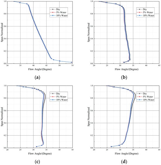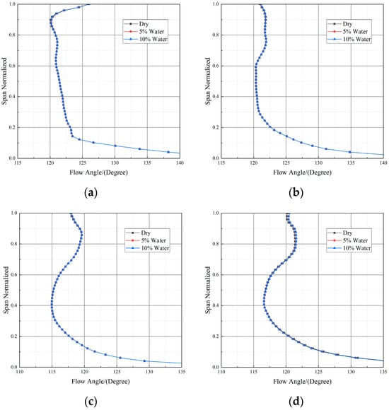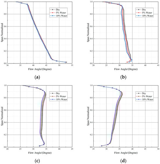 Inlet airflow angle of stator at different water ingestion rates (Case CH4). (a) Stage 1; (b) Stage 2; (c) Stage 4; (d) Stage 5.