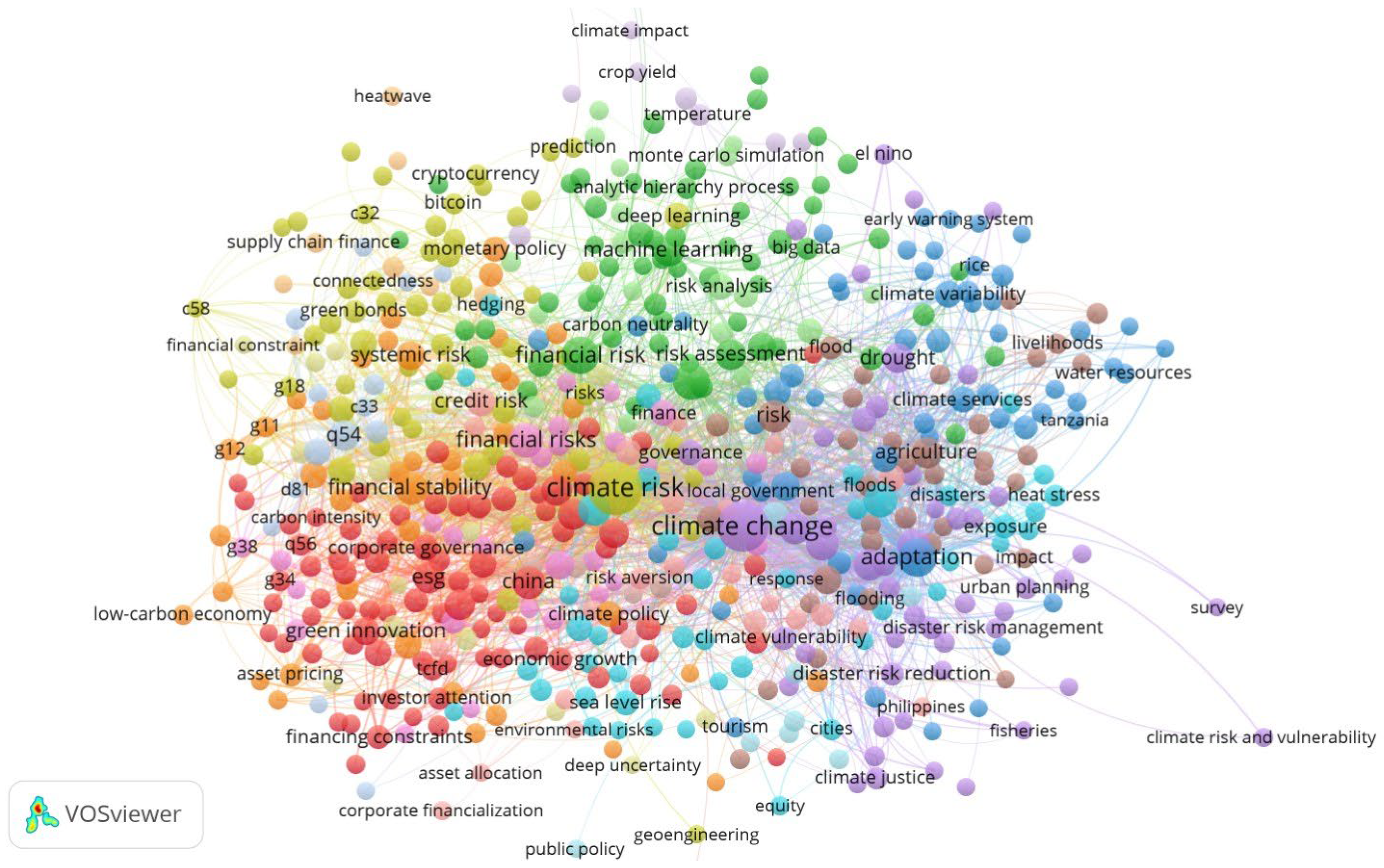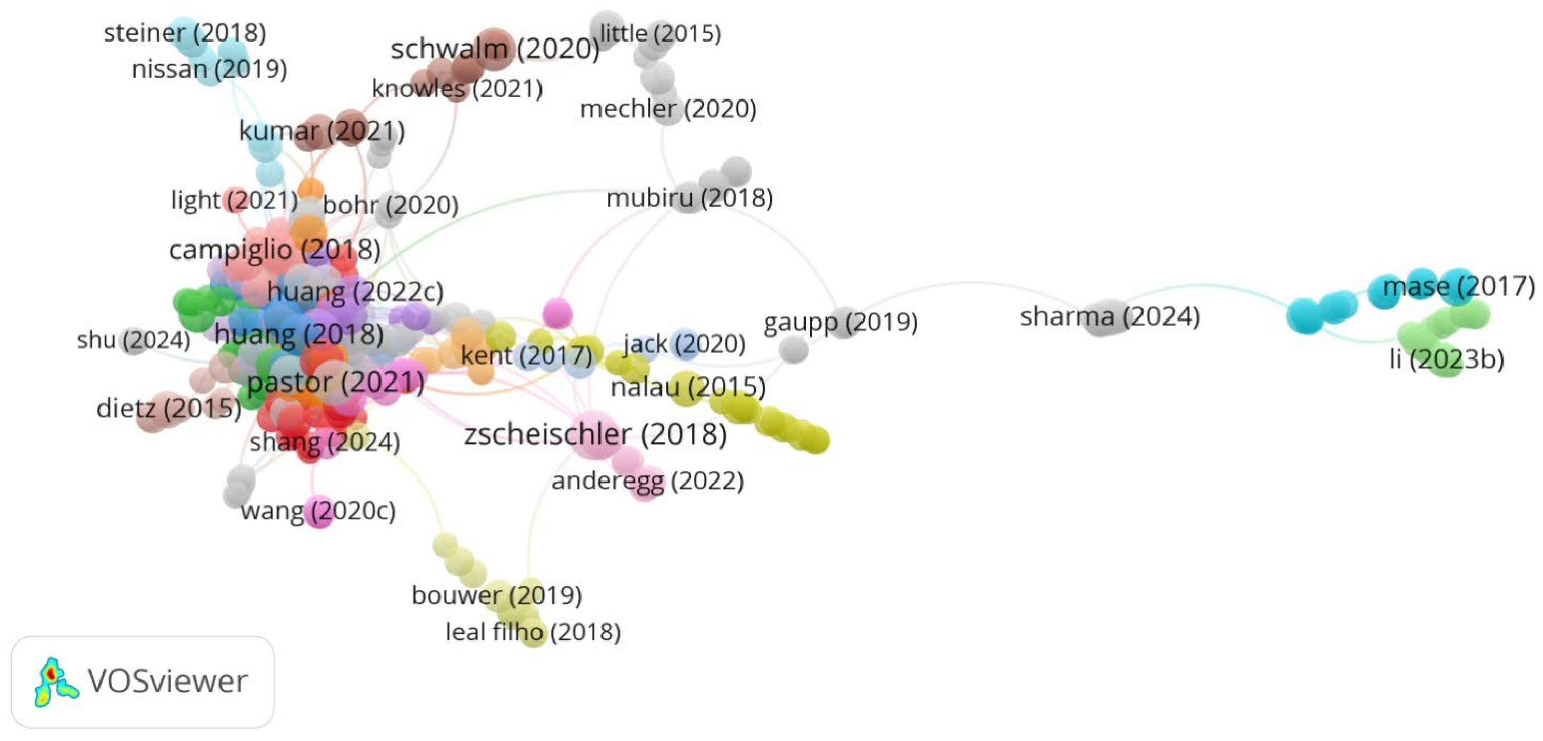 The contribution of this study is threefold. First, to rigorously capture these interconnections, our study adopts an advanced empirical analysis design, based on robust regression with Huber and biweight iterations and quantile-on-quantile (Q–Q) regression. This methodological selection enables the analysis of firm behavior under conditions of high variability and non-uniform data distributions. Such approaches are applied to a sample of 300 firms in the European energy industry in 2024, sourced using LSEG Data & Analytics. In addition, this first contribution reflects the study’s integrative perspective, which jointly examines CSR engagement, renewable energy investment, and sustainable finance as interconnected determinants of firms’ exposure to climate-related financial risks—an angle seldom treated simultaneously in existing literature. Our empirical results offer new insights into the ongoing initiatives by many international organizations to accelerate their transition to low-carbon operating models in the European energy sector. Thus, the analysis also examines how the company manages its climate risk strategies, which influence its performance and investors’ perceptions of risk. In this sense, the research investigates how elements such as green finance, emission-reduction policies, investments in green technologies, and the adoption of effective sustainable governance practices shape the company’s capacity to respond to climate challenges in a high-performing, cost-effective manner. Second, advancing methodological rigor would provide a basis for a comparative examination of a company’s actions and responses to climate-related pressures, allowing analysis of how financial risks related to climate change are distributed across different conditions or segments. Third, it complements the empirical results with an adequate review of the relevant literature, which maps the intellectual trends and thematic focuses in sustainability research. The proposed approach examines the impact of climate-related financial risks on firms’ sustainability performance, with a particular emphasis on renewable energy and access to sustainable finance. This extensive examination of scientific literature is carried out with the support of VOSviewer software (version 1.6.20) for a decade-long period, from 2015 to present, in the Web of Science Core Collection. This bibliometric approach strengthens the paper’s contribution by identifying research clusters, influential publications, and international collaboration patterns, thereby positioning the study within the most recent scientific developments in sustainable finance and energy transition research.