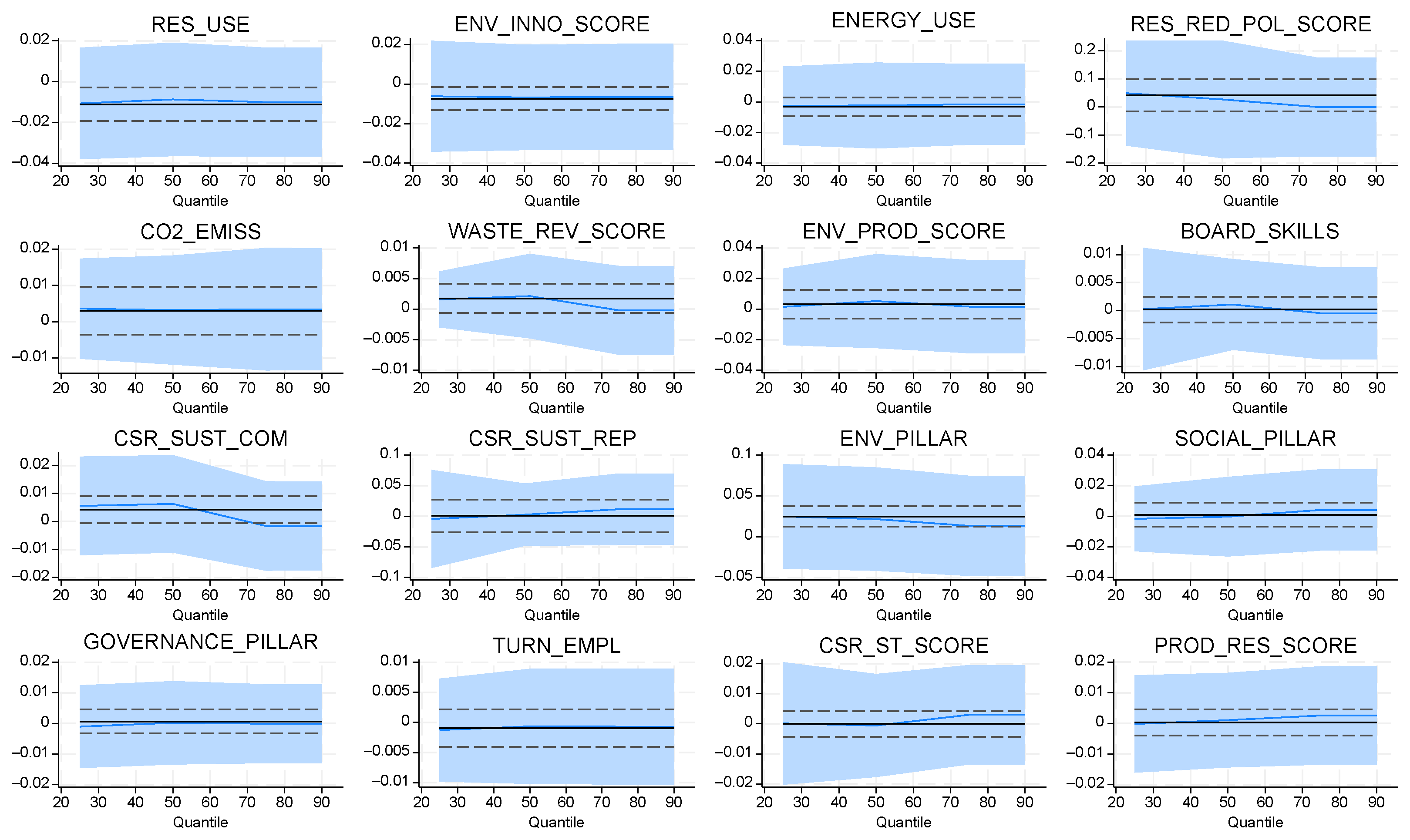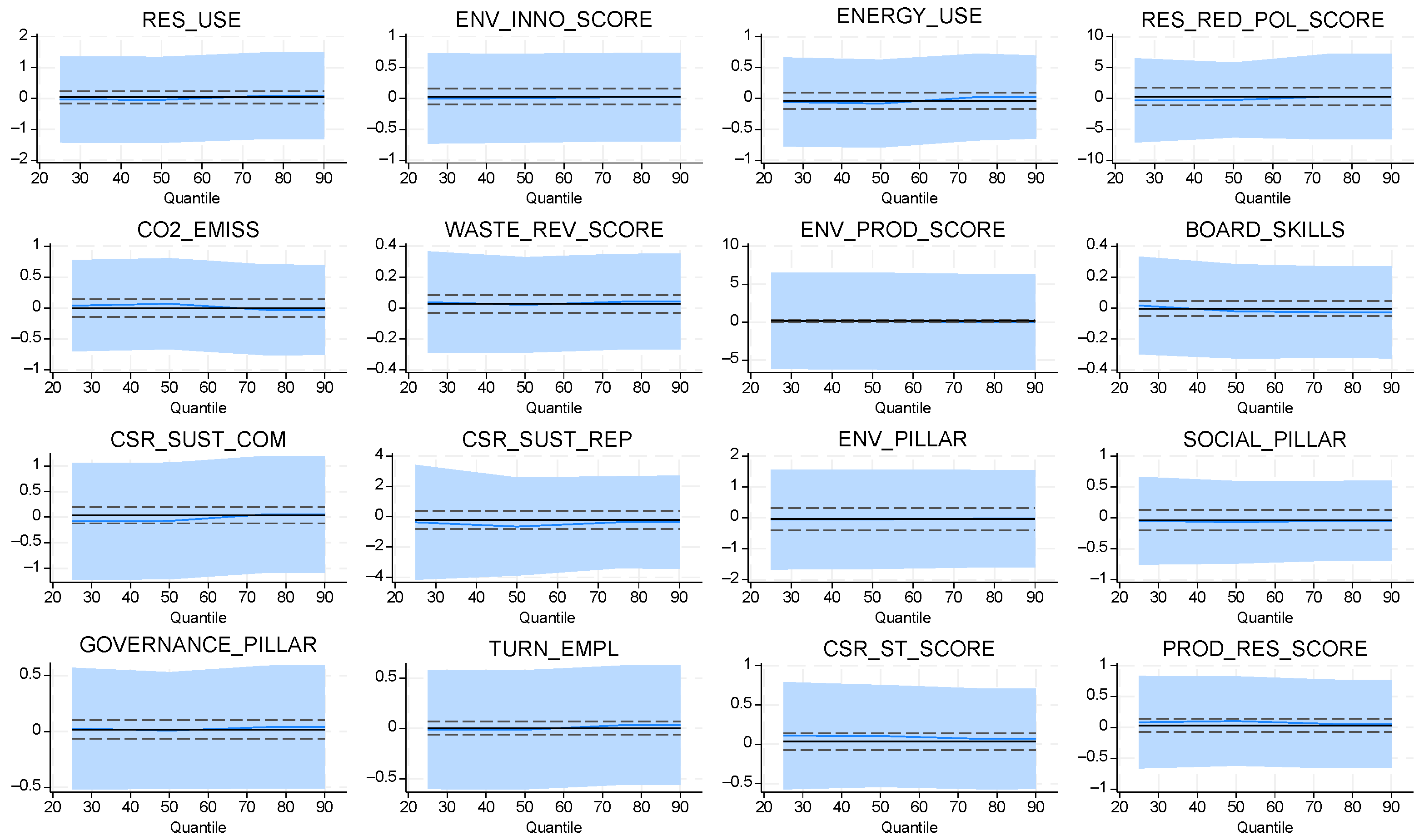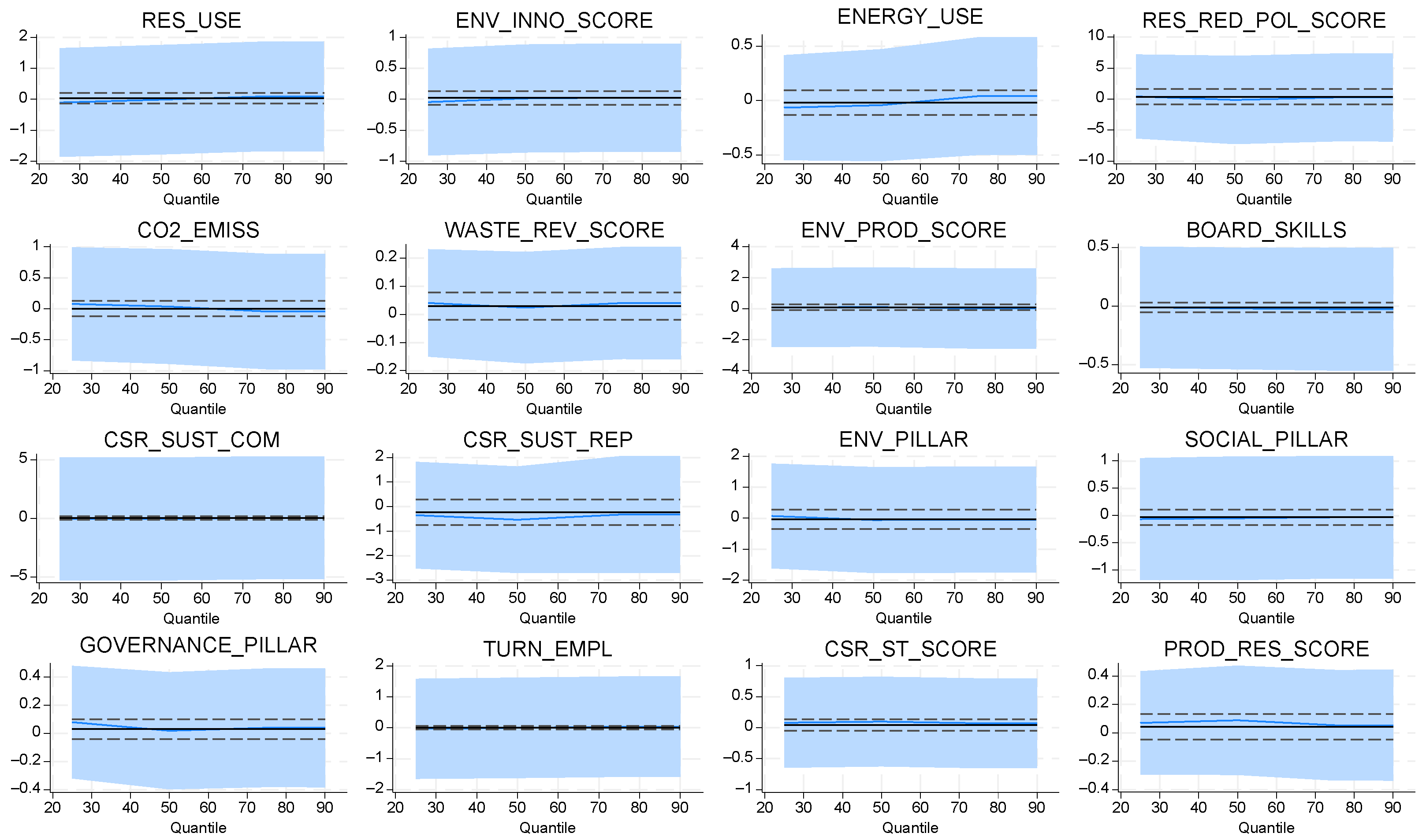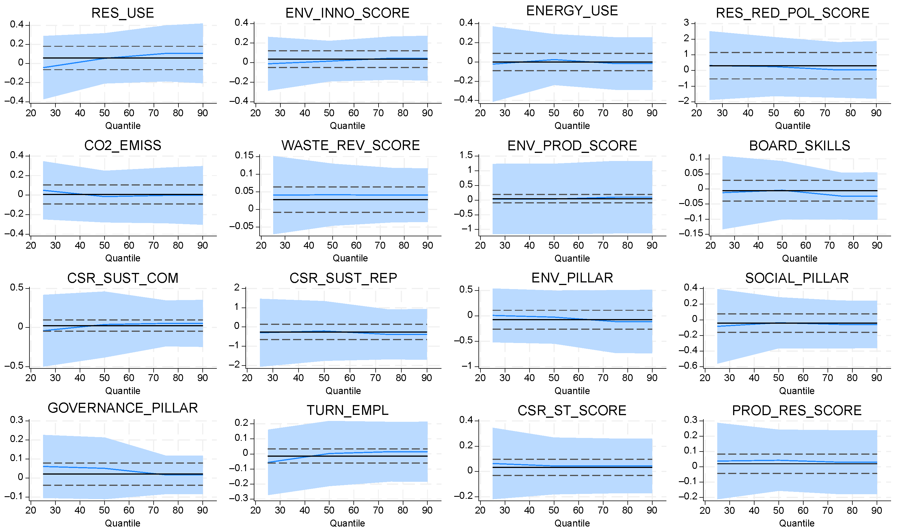 Figure 12 reveal a predominantly moderate and stable association between sustainability dimensions and climate-risk exposure once extended financial controls are included. Most indicators exhibit coefficient paths centered around zero with relatively narrow confidence bands, indicating limited distributional sensitivity and suggesting that the incremental explanatory contribution of sustainability attributes is attenuated when profitability-adjusted outcomes are modelled. Nonetheless, several variables—particularly RES_USE, ENV_PROD_SCORE, and ENV_PILLAR—display mild upward slopes across higher quantiles, suggesting that environmental performance exerts a more pronounced influence among firms in elevated risk states. Conversely, governance-related measures such as BOARD_SKILLS and GOVERNANCE_PILLAR appear largely invariant across quantiles, signaling that internal governance structures maintain uniform effects irrespective of firms’ risk positions.