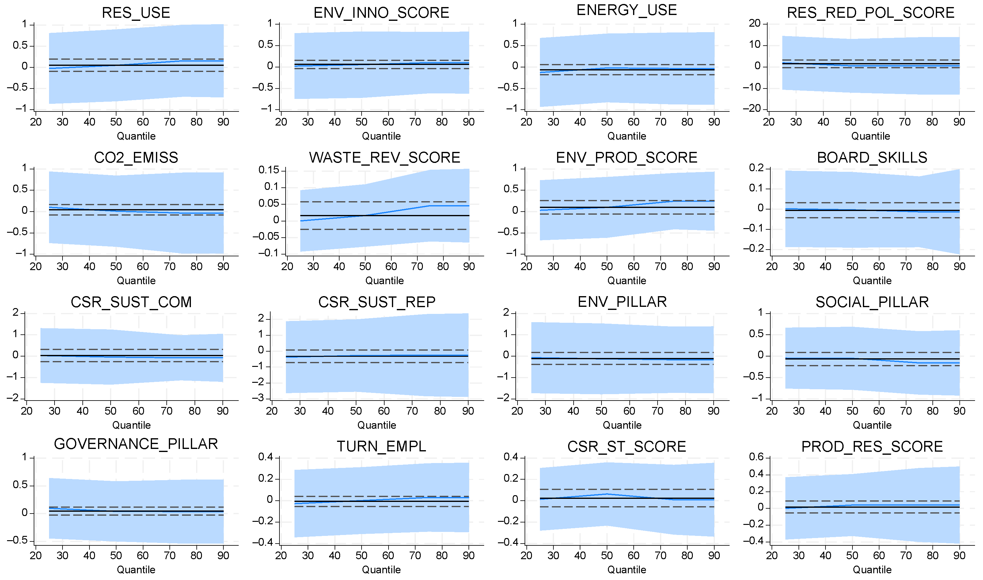Figure 11 display, for each key sustainability indicator, the estimated Q–Q coefficient across the conditional risk distribution together with its pointwise confidence band. Overall, most relationships appear relatively stable around zero, indicating that for a large subset of CSR, environmental, and governance variables, the marginal effect on climate-risk exposure does not vary strongly across quantiles. However, several indicators exhibit pronounced slope and band-width changes. For instance, RES_USE, ENERGY_USE, and ENV_PILLAR show mildly increasing profiles towards the upper quantiles, suggesting that the risk-mitigating (or risk-amplifying) impact of these variables becomes more pronounced for firms in higher-risk states. Conversely, the nearly flat curves for CSR_SUST_COM, CSR_SUST_REP, and GOVERNANCE_PILLAR imply that the influence of institutional CSR governance is largely homogeneous across the risk spectrum.