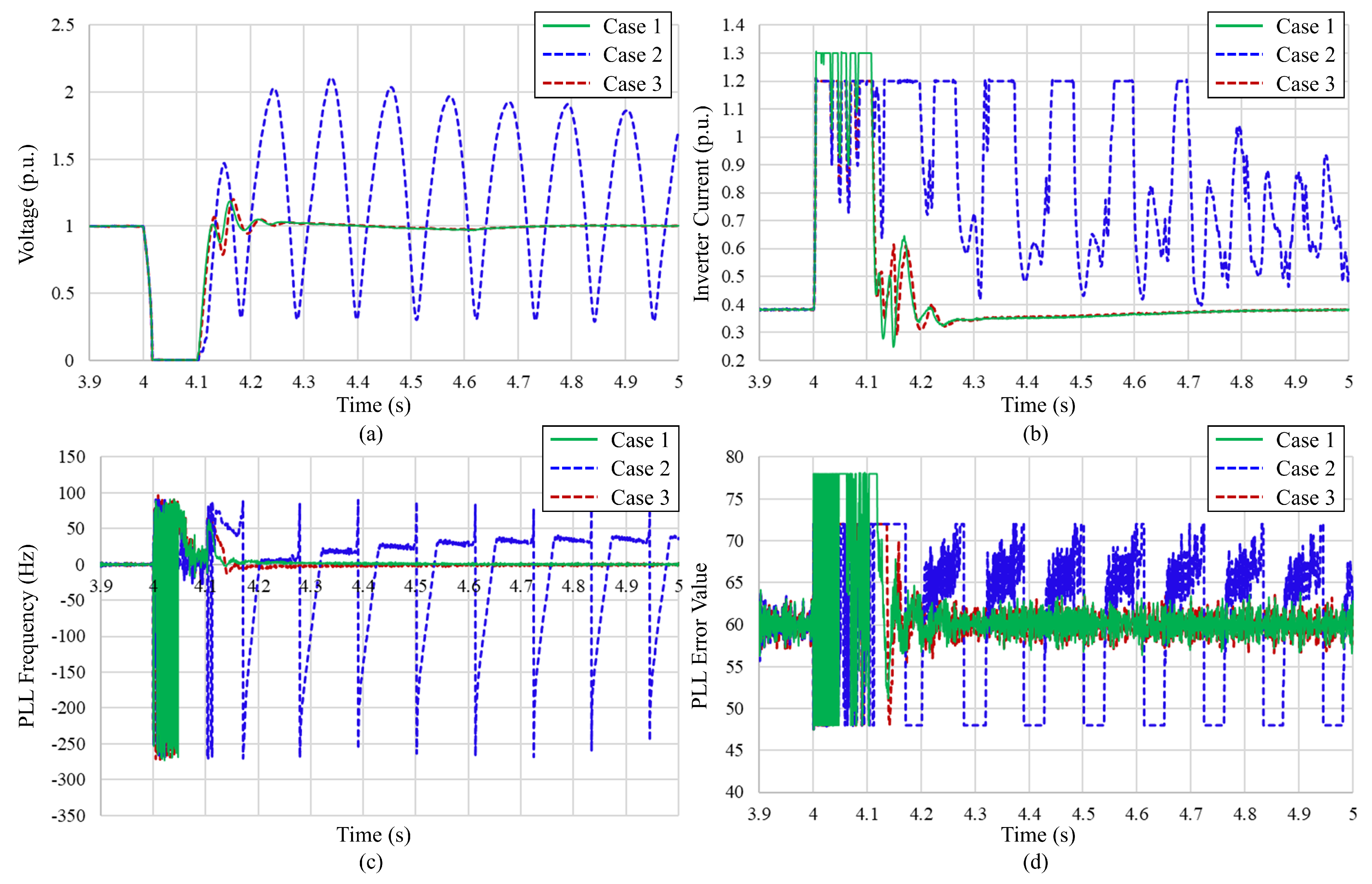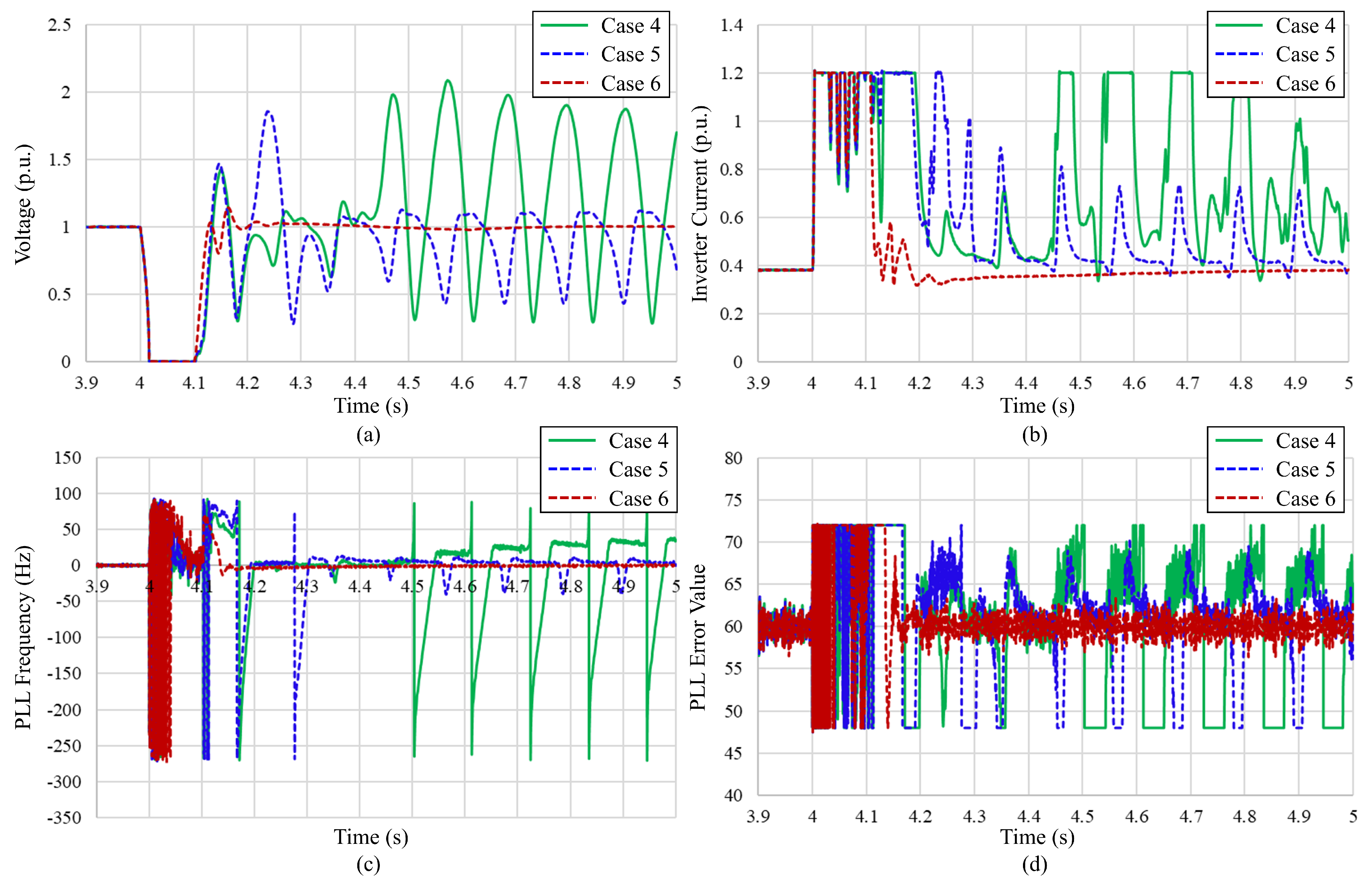 4.5.2. Cases 4–6: Effect of Reduced Grid Strength on