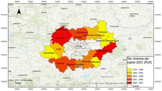 Tax revenue per capita of the municipalities around Kraków for 2021.