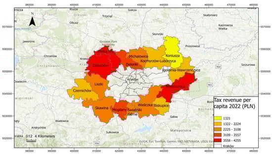Tax revenue per capita of the municipalities around Kraków for 2022.