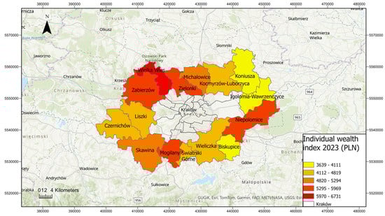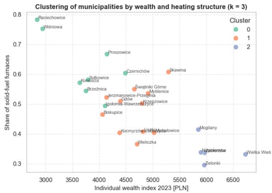 - Cluster 2—High-wealth, low solid-fuel dependency (blue). This cluster encompasses wealthier suburban municipalities, including Zielonki, Zabierzów, and Wielka Wieś. These localities are characterized by high individual wealth indices (above 5500 PLN) and a low share of solid-fuel furnaces (below 0.4). This group represents the most advanced stage of energy transition, likely benefiting from higher household incomes, better infrastructure, and proximity to urban centers.