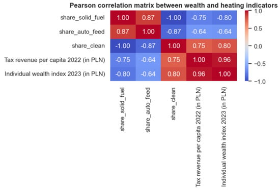 The empirical analysis was conducted using municipal level data describing the heating structure and socioeconomic conditions. Derived variables were constructed to allow for proportional comparison between localities. The share of solid fuel furnaces and share of furnaces with automatic feeders were calculated as ratios of respective heating types to the total number of heating sources in a municipality. The share of clean heating was defined as the complement of solid fuel heating (1—share of solid fuel furnaces), serving as a proxy for the prevalence of low-emission or modern heating technologies. All fiscal and wealth indicators, including tax revenue per capita (2022) and the individual wealth index (2023), were expressed in Polish Złoty (PLN). At this stage, data preparation and computation were performed in Python 3.11 using the pandas library [46].