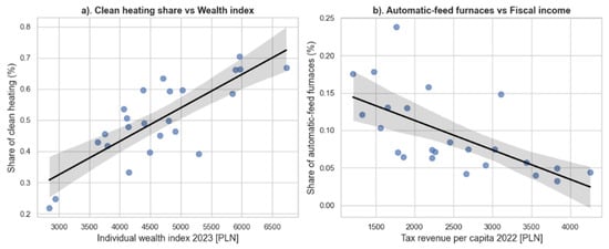 Scatterplots showing relationships between heating indicators and economic variables. Solid lines represent linear regression fits, and shaded areas indicate the 95% confidence intervals around the regression lines. (a) Share of clean heating systems (%) versus Individual Wealth Index (PLN) in 2023. (b) Share of automatic feed furnaces (%) versus Tax revenue per capita (PLN) in 2022.