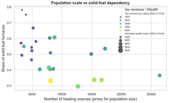 Figure 6 illustrates the relationship between population size, represented by the number of heating sources, and the share of solid-fuel furnaces across various localities. The analysis integrates two additional socioeconomic indicators: tax revenue per capita in 2022 (color gradient) and the individual wealth index in 2023 (bubble size), both expressed in PLN. A clear inverse relationship emerges between locality size and reliance on solid fuels. Smaller municipalities, often exceeding 50–70%. In contrast, larger towns demonstrate a markedly lower dependency, with shares generally below 40%. The color and size dimensions further reveal a consistent socioeconomic pattern. Localities with higher tax revenues and greater individual wealth (represented by lighter colors and larger bubbles) tend to display lower solid fuel usage rates. Conversely, communities characterized by lower fiscal capacity and wealth levels (darker colors, smaller bubbles) show persistent dependence on traditional solid-fuel heating. Those findings are in line with results from OLS regression.