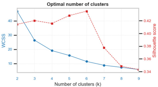 - Silhouette coefficient—Evaluating cohesion and separation simultaneously [51], where values closer to 1 indicate better defined clusters.
