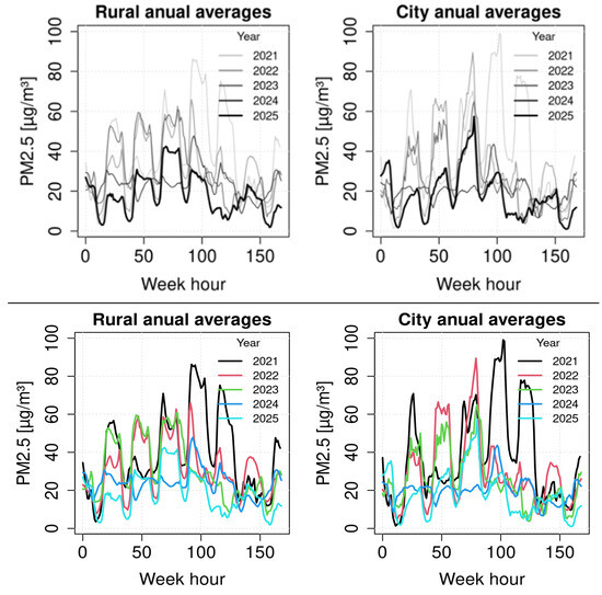 An important feature is the differing temporal structure of mean concentrations between urban and rural sites. In the city, the typical two-peak pattern of diurnal PM2.5 variation observed during smog episodes is largely absent, and the peak concentrations appear with a temporal delay relative to the surrounding rural stations. A systematic temporal delay of urban PM2.5 peaks relative to surrounding rural stations cannot result from local circulation alone and indicates advective transport of pollution generated outside the city. Particularly noteworthy is the remarkable similarity in the shape and timing of the major pollution episode centered within each analyzed week, which remains consistent across the five-year period.