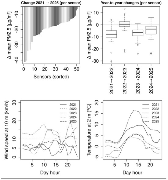 Changes in mean PM2.5 concentrations recorded by individual sensors over consecutive years for the week with the strongest smog episode and general meteorological background. The upper left panel shows the difference between the mean values from 2021 and 2025 for each sensor (sorted in ascending order), while the upper right panel presents the distributions of year-to-year changes. Lower panels show wind speed and temperature observed near Kraków airport Balice.
