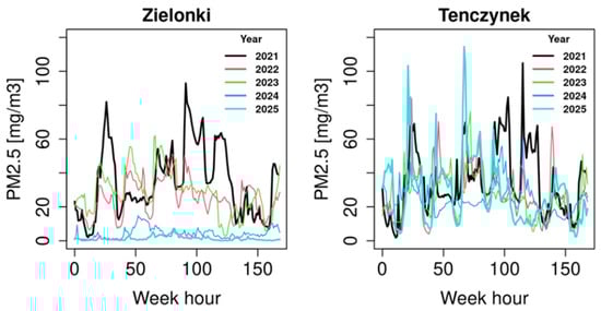 Changes in hourly PM2.5 concentrations during the weeks with the highest smog episodes in 2021–2025 at two locations: Zielonki (left) and Tenczynek (right), illustrating differences in amplitude, diurnal structure and timing of concentration maxima.