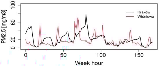 Figure 13 shows the spatial distribution of the loadings of the second principal component (PC2) calculated on the common PCA base, presented in the UTM 34N coordinate system. The color indicates the sign of the loadings (red—positive, blue—negative), while the point size represents their absolute magnitude. Sensors located in Kraków and its immediate surroundings generally display positive loadings, whereas the further and higher above the city the sensor is located, the greater the observed PC2 values. To illustrate this contrast, two sensors were selected for detailed comparison: the one with the most negative loading (37925—Wiśniowa) and the urban sensor with the most positive loading (7514—Kraków). This comparison is presented in Figure 14, which clearly shows the characteristic “old stove” emission pattern in Wiśniowa during the smog episode, as well as the typical time lag in concentration peaks observed for the Kraków sensor.