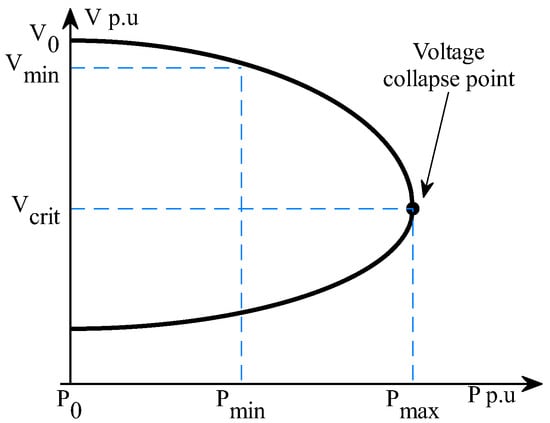 Several studies have addressed this issue using P-V curve analysis (shown in Figure 1), which allows the behavior of the system in a steady state to be evaluated as the load on a specific busbar is progressively increased until a voltage collapse point is reached. This curve establishes the relationship between the real power (P) transferred and the voltage (V) at the receiving node, providing information on the stability margin of the system [34,35].