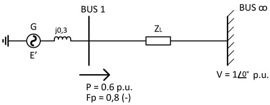 As a complement to the static analysis, the initial delta angle () of the synchronous generator is evaluated in the infinite bus generation model, which represents the initial conditions of the system before and after hybridization. The electrical power for a predominantly inductive system is described by (1), while for a system with resistive-inductive impedance, Equation (2) [36] is used. Figure 2 illustrates the P– curve, which helps to contextualize the steady state of the system and its behavior in response to changes in the power grid configuration.