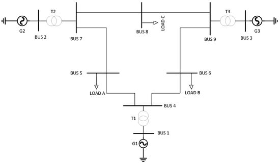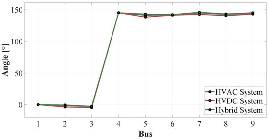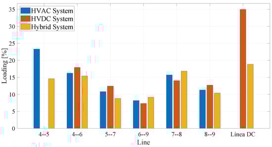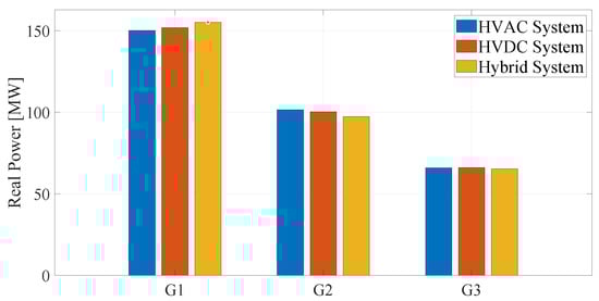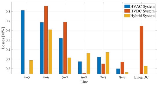 As a first step, the infinite bus generation electrical system is parameterized with the data shown in Figure 4, and the 9-bus IEEE (whose data is shown in the tables in the Appendix A). Then, the OPF-AC is calculated considering Equations (3)–(16), and the results are saved for comparison with the hybrid system. With these results, the critical link corresponding to the TL with the highest load capacity is identified, in which the hybrid system is modeled by adding an HVDC line (the HVDC line model is shown in Figure 3) in parallel to the existing HVAC line with the electrical parameters of the existing AC line. Next, the AC OPF is recalculated to obtain the hybrid system data for the results analysis.