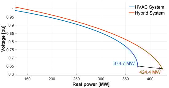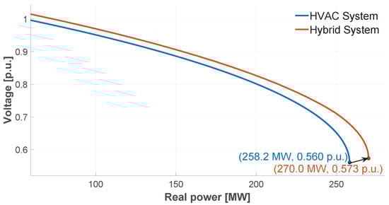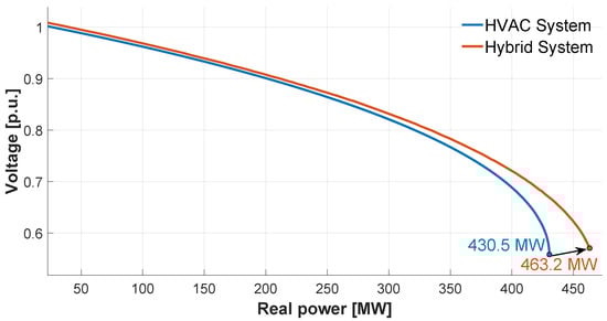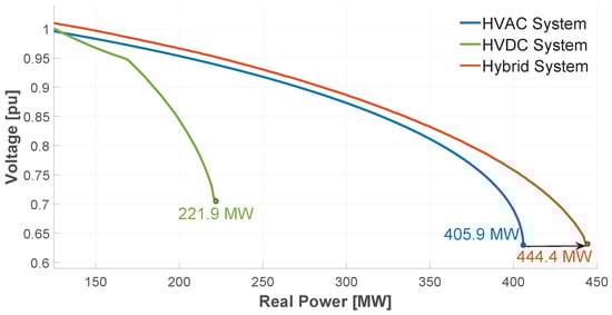 Likewise, strategies based on multi-objective optimization have been explored to improve stability and economic efficiency [18], and techniques have been proposed for the optimal location of these devices, with favorable results in reducing losses and increasing the stability margin [23,24]. On the other hand, recent work has evaluated the integration of HVDC systems, especially those based on VSC, showing significant improvements in voltage stability and load capacity, even under adverse conditions and contingencies [16,17]. However, most of this research does not consider static evaluation using P-V curves or the combined impact of HVAC-HVDC hybridization on stability under normal conditions and contingencies.