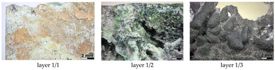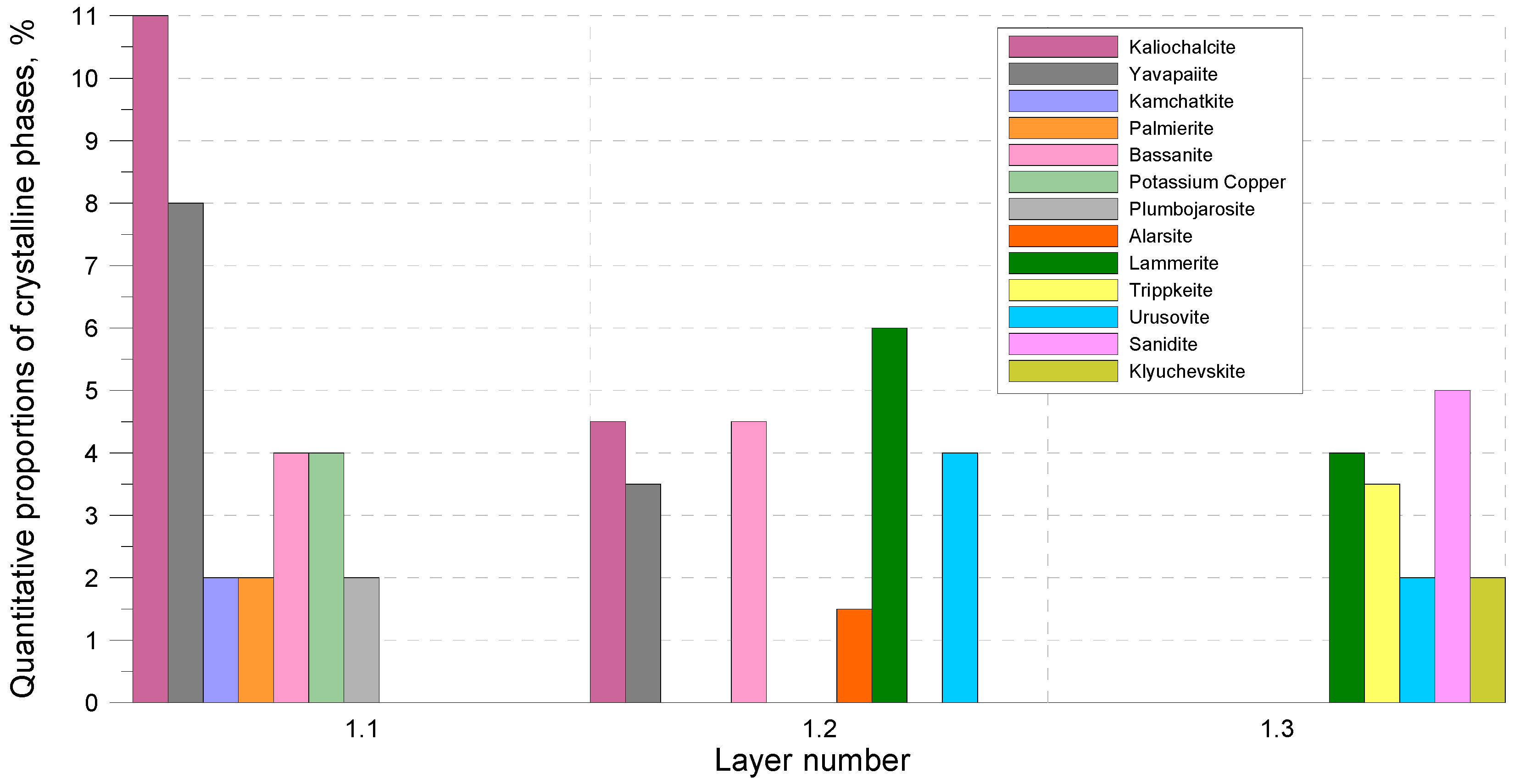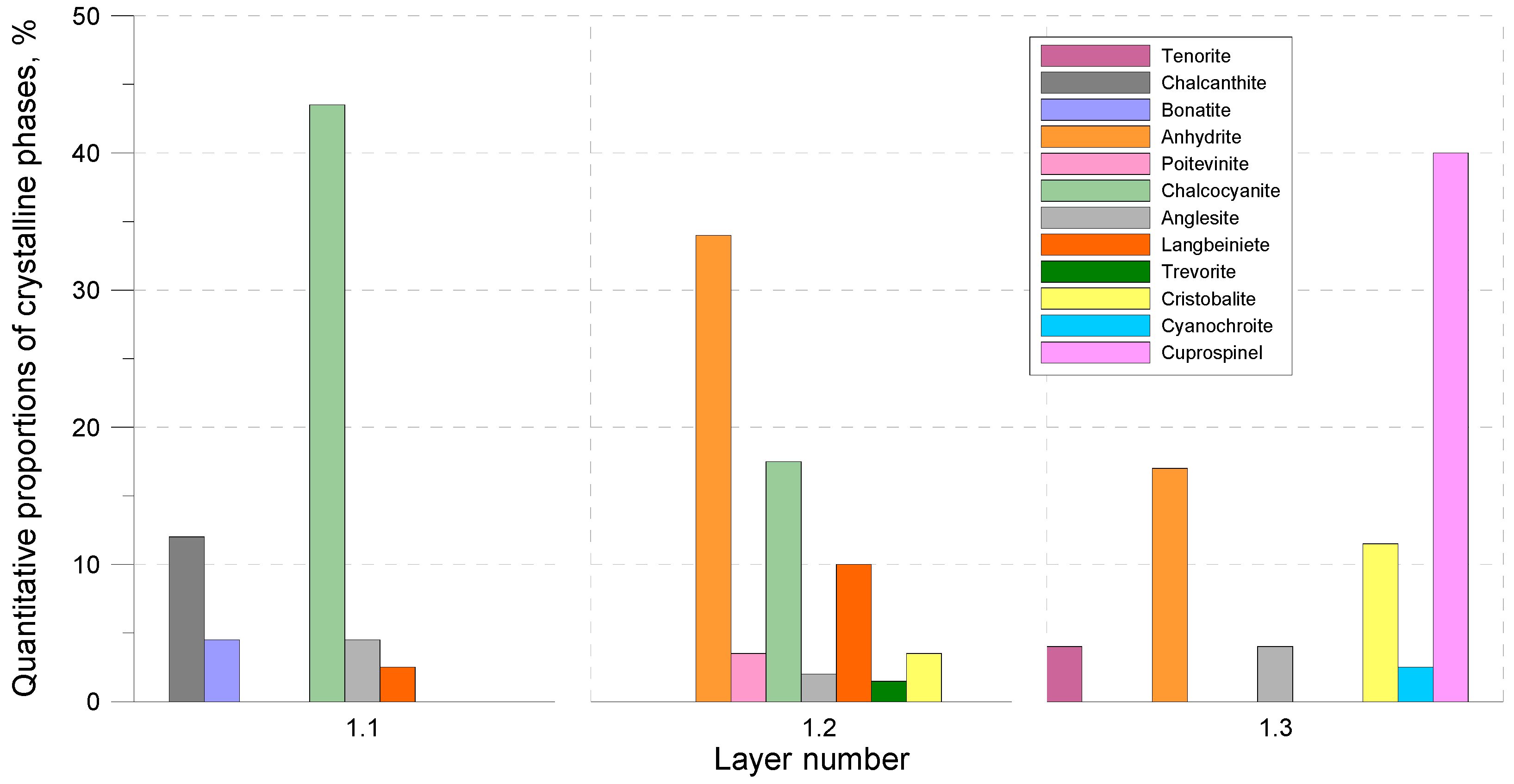 XRD analysis showed that, in the 1/1 layer, sulphates, i.e., chalcocyanite (more than 40 wt.%), chalcanthite, and yavapaiite, prevail in the phase constitution. Anhydrite, chalcocyanite, and langbeinite prevail in the central 1/2 layer. Cuprospinel, anhydrite, and cristobalite prevail in layer 1/3 (Figure 6 and Figure 7).