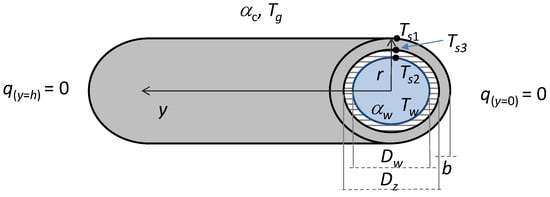 The temperature distribution of heat exchanger tubes in the waste heat recovery boiler was computed with the finite element method using an axi-symmetrical solution of the heat conductivity equation. The computing was carried out for a clean tube surface and for a case with loose and bound deposits present on the surface with thicknesses of 0.5 cm, 1 cm, and 2 cm. The applied finite element method is described in [16]. On both sides of the tube surface, the second boundary condition was assumed (Figure 8). The density of heat flux transferred between the post-process gas and the outer surface of the tube was calculated from the equation
