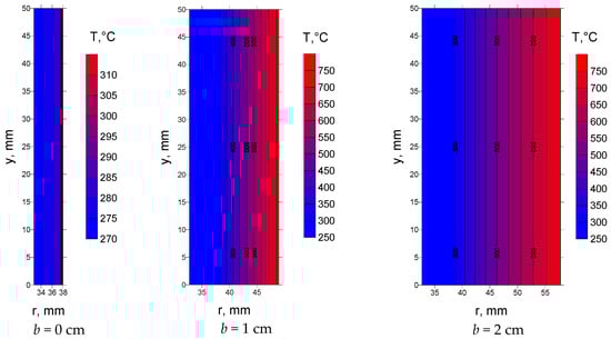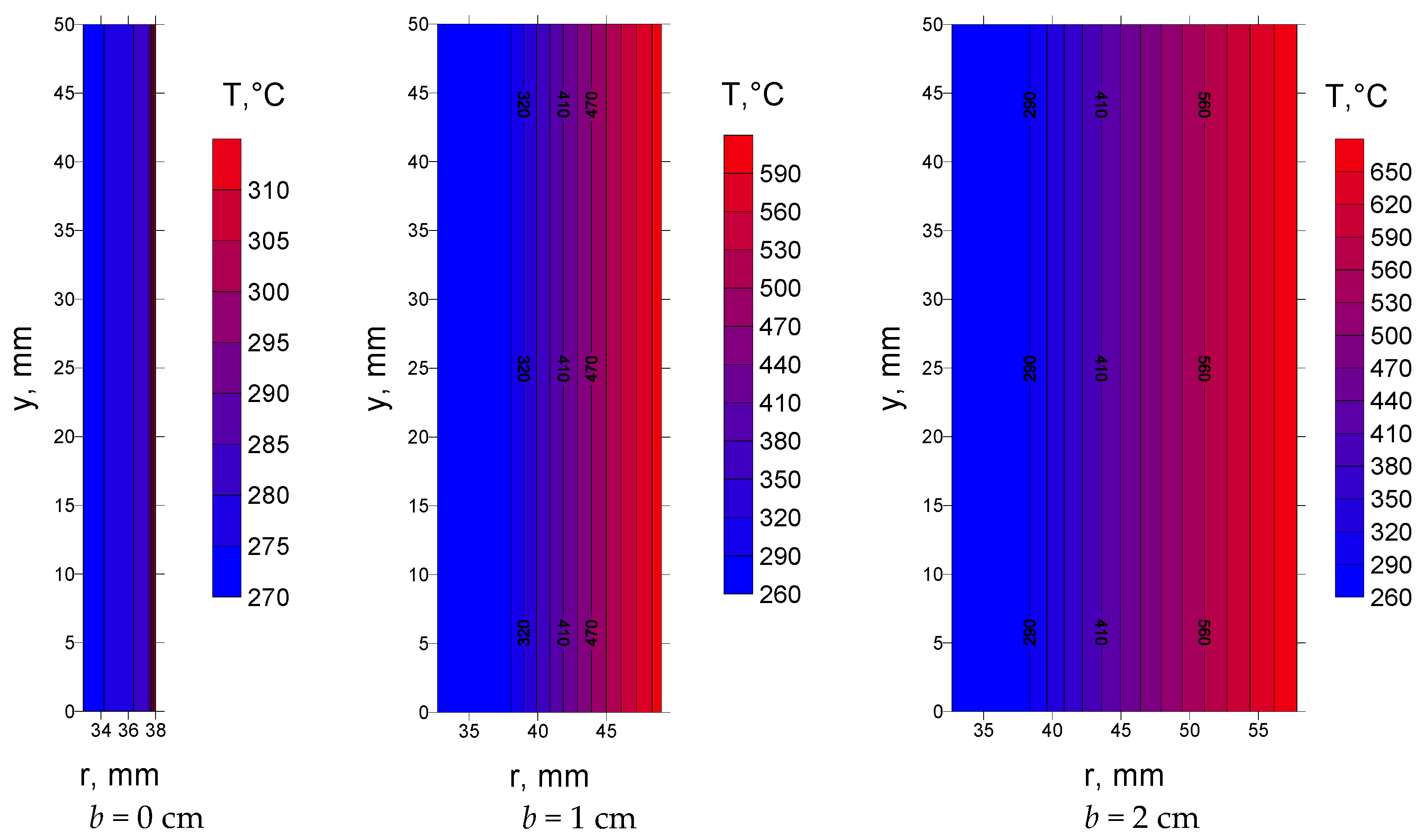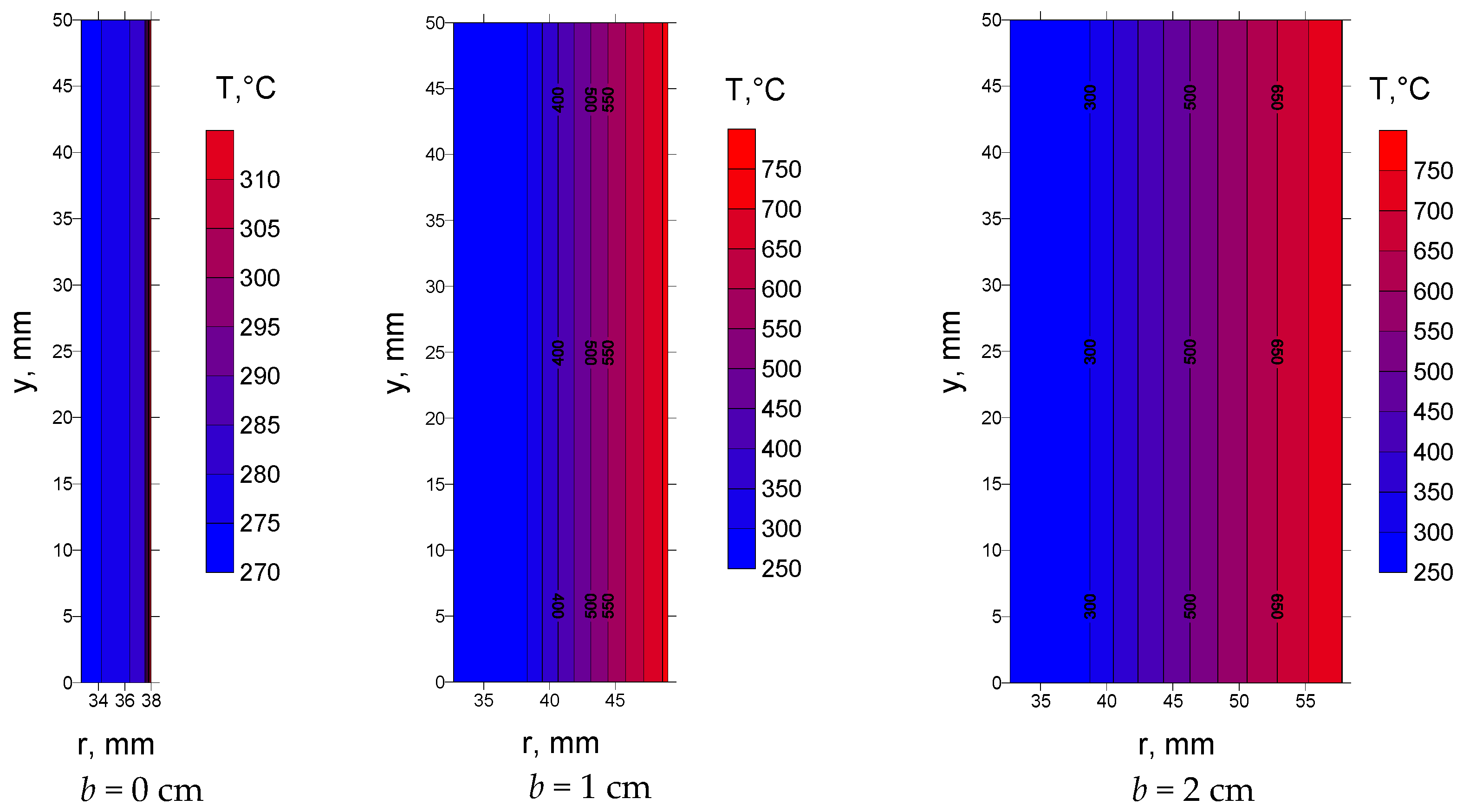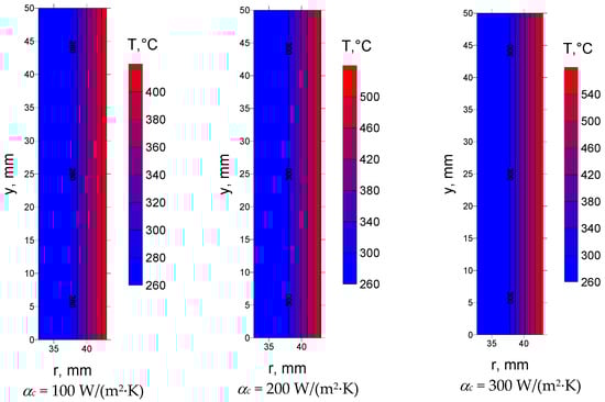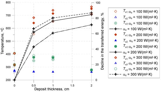 Figure 9 and Figure 10 show a comparison of the obtained temperature at three points on the tube cross-section (Figure 8) and a drop in the energy transferred versus growth in the thickness of a bound and loose deposit. The findings are presented after obtaining the conditions of stationary heat exchange. As the deposit thickness grows, the temperature difference between the inner and outer surfaces of the tube increases. This effect is related to the increase in the heat transfer surface area and the related declining rate of the increase in the resistance of heat conduction through the deposit layer. The smallest differences occur for the small thicknesses of deposits. The deposit surface temperature increases as its thickness increases, and it becomes similar to the temperature of dusty gases. For 2 cm of a bound and loose deposit, the surface achieves a high temperature of about 600–750 °C, depending on the process conditions. As observed in [4], the flux of transferred heat changes. As a result of an increase in the thickness of the deposit, the amount of energy that has been transferred declines. For the loose deposits, the decline is rapid at the initial build-up period to a deposit thickness of 0.5 cm and reaches 70% for the highest heat transfer coefficient. For the bound deposits, similar values of the decline in the energy transferred were achieved for the deposits with a thickness of 2 cm. The findings show that, for the loose deposits, it is important to periodically monitor the increase in their thickness and to use the possible methods for their removal in order to ensure the high efficiency of the plant and to prevent the formation of bound deposits. The deposits can block the flow of gas, impairing heat transfer and increasing the off-gas temperature, which reduces the thermal efficiency of the boiler. Figure 11 and Figure 12 show the temperature field in the tube cross-section with 0.5 cm of bound and loose deposits. Figure 13 and Figure 14 show the temperature field in the tube cross-section as well as bound and loose deposits of various thicknesses (αc = 200 W/(m2·K)).