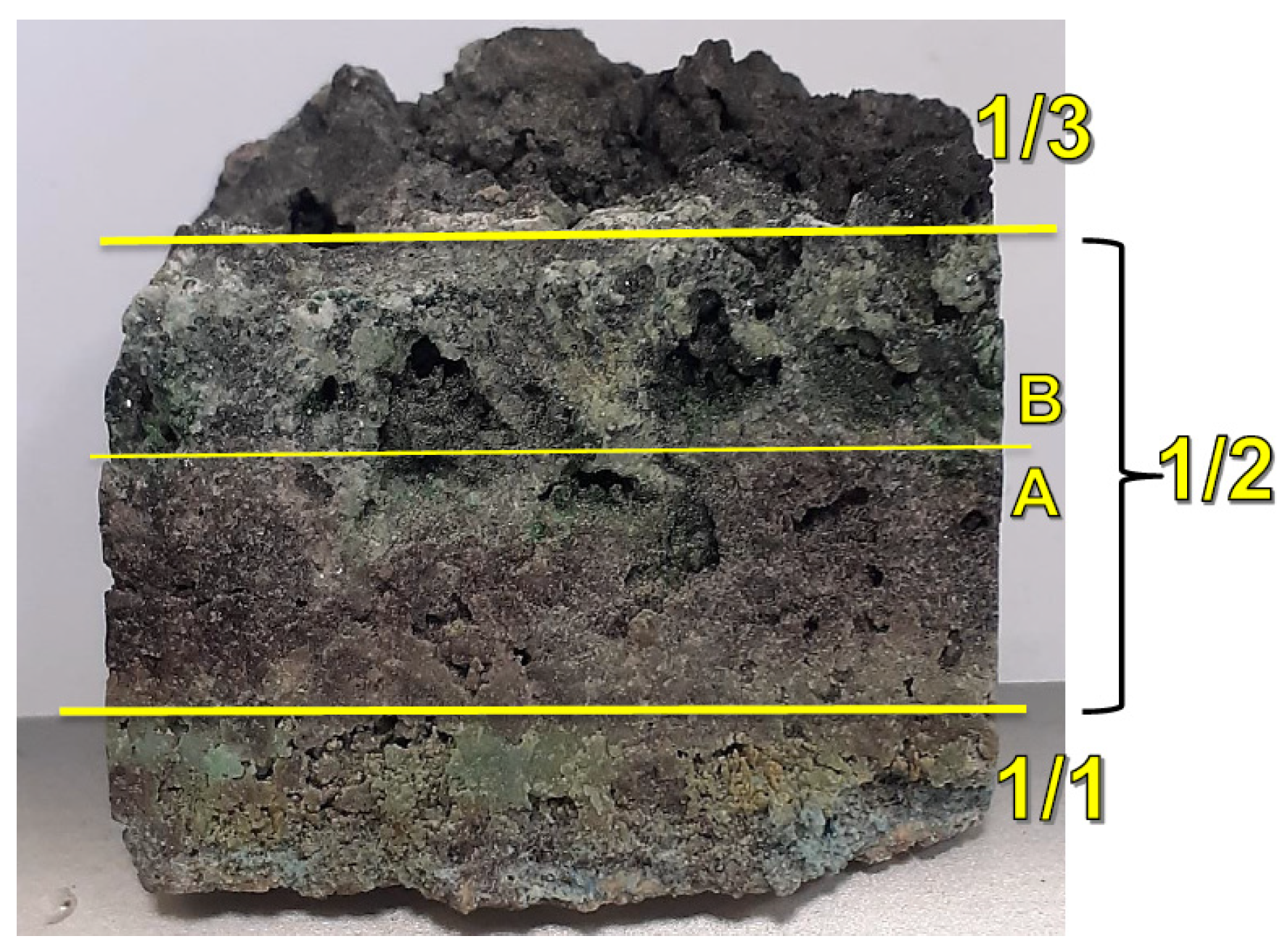 The study analysed the deposit forming on the heat exchanger tubes. The morphology and chemical constitution of the deposit were analysed. The quantitative analysis was carried out with the X-ray fluorescence method (XRF), mineralogical and lithological analysis with scanning electron microscopy (SEM), and phase analysis with the X-ray diffraction method (XRD). Tests were carried out on a deposit taken from the radiation zone of the waste heat recovery boiler (Figure 1). The tested deposit showed a distinct laminar structure. Therefore, the deposit was divided into three layers: 1/1 (tube side), 1/2, and 1/3 (Figure 2 and Figure 3), differing in the phase constitution and in the form and size of the crystals. Layer 1/2 was further divided into two sub-layers, A and B. The laminar structure is caused by a gradual increase in the surface temperature of the growing deposit, which results in changes in the process of fly ash settling and changes in the deposited material, i.e., grain growth and recrystallization.