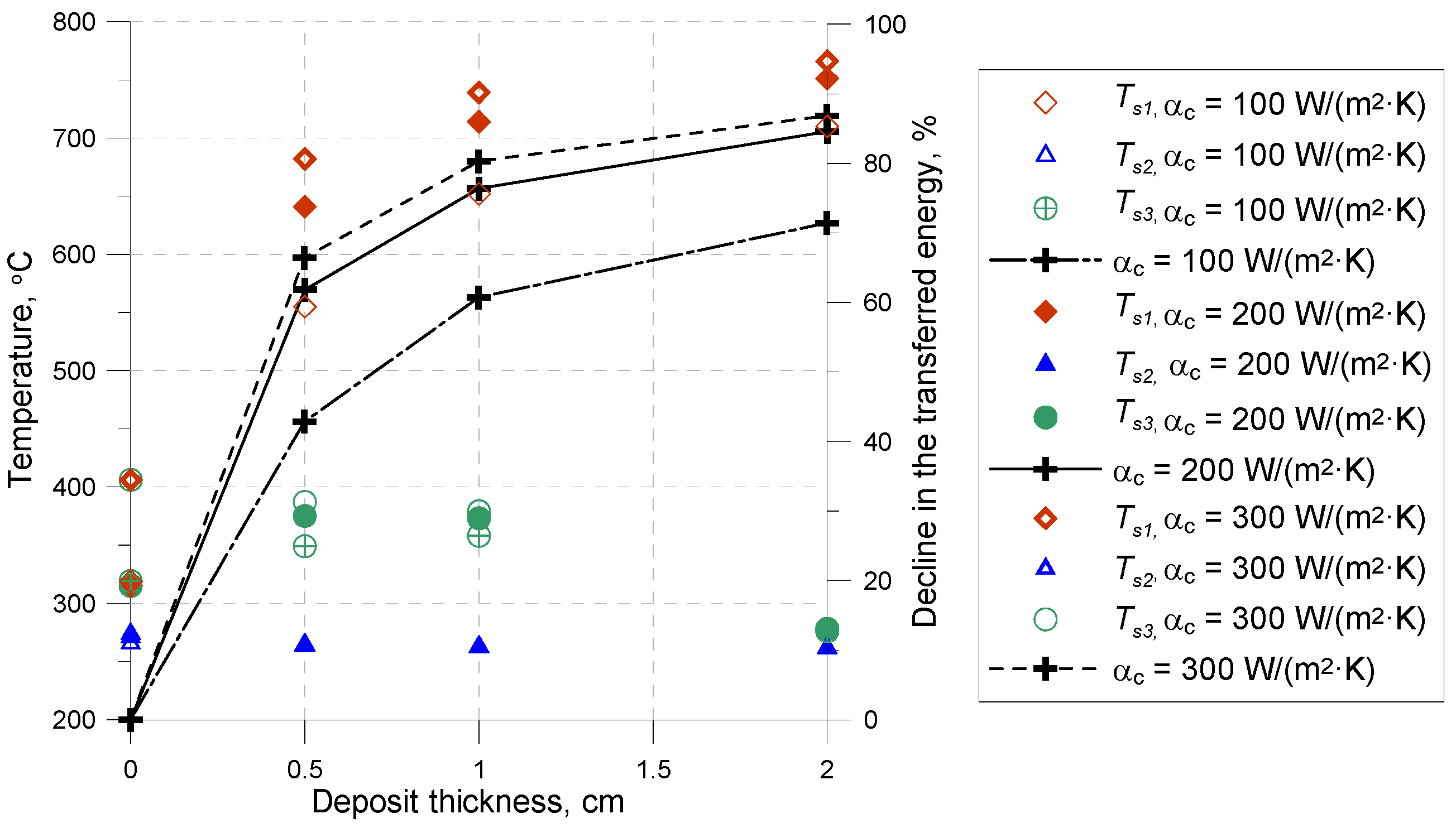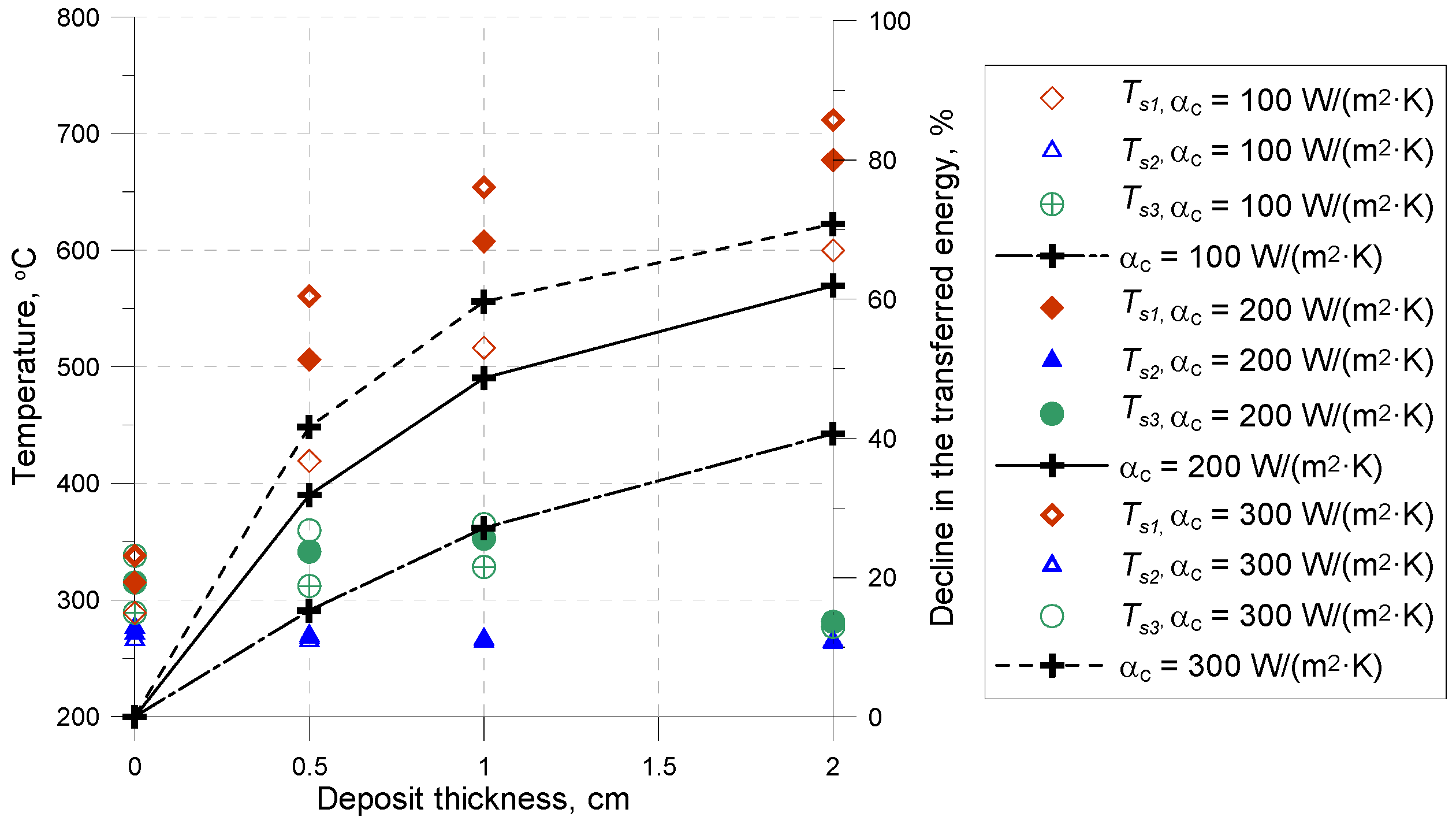 - The initial temperature of the internal and external surface Ts1 and Ts2 of the tube, without a deposit and with a deposit, was 250 °C;