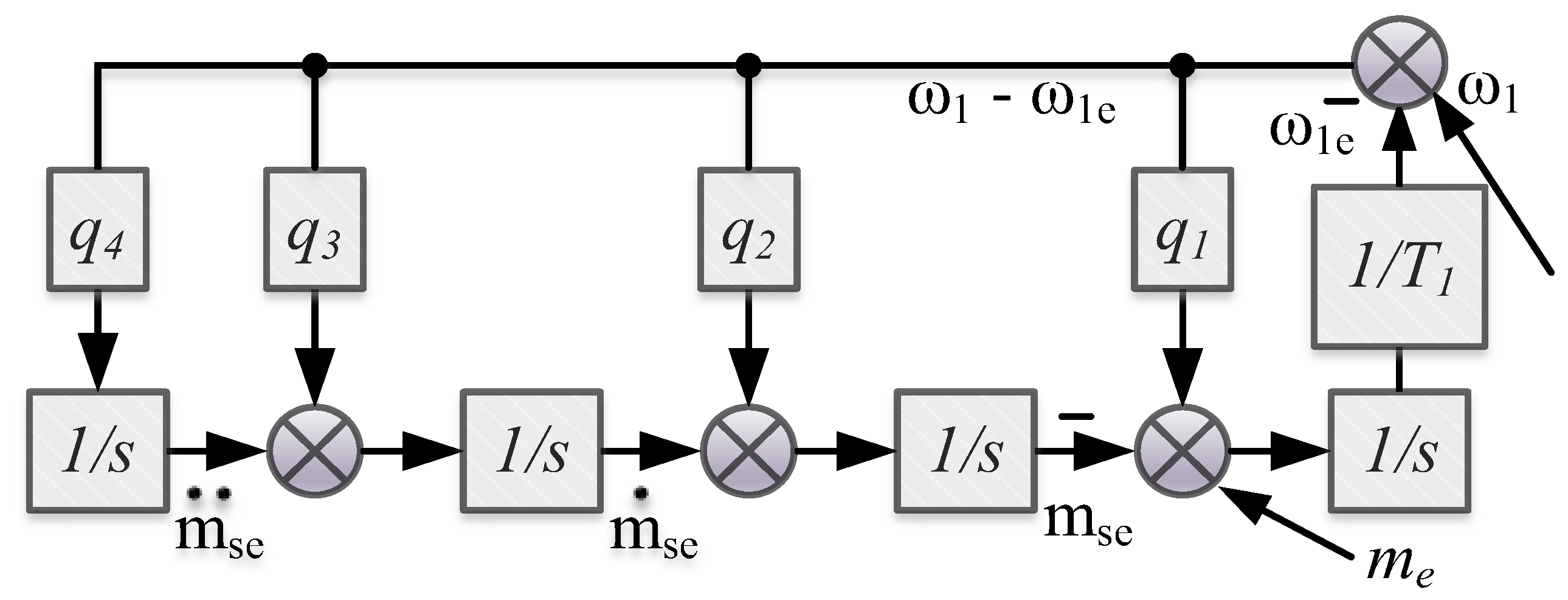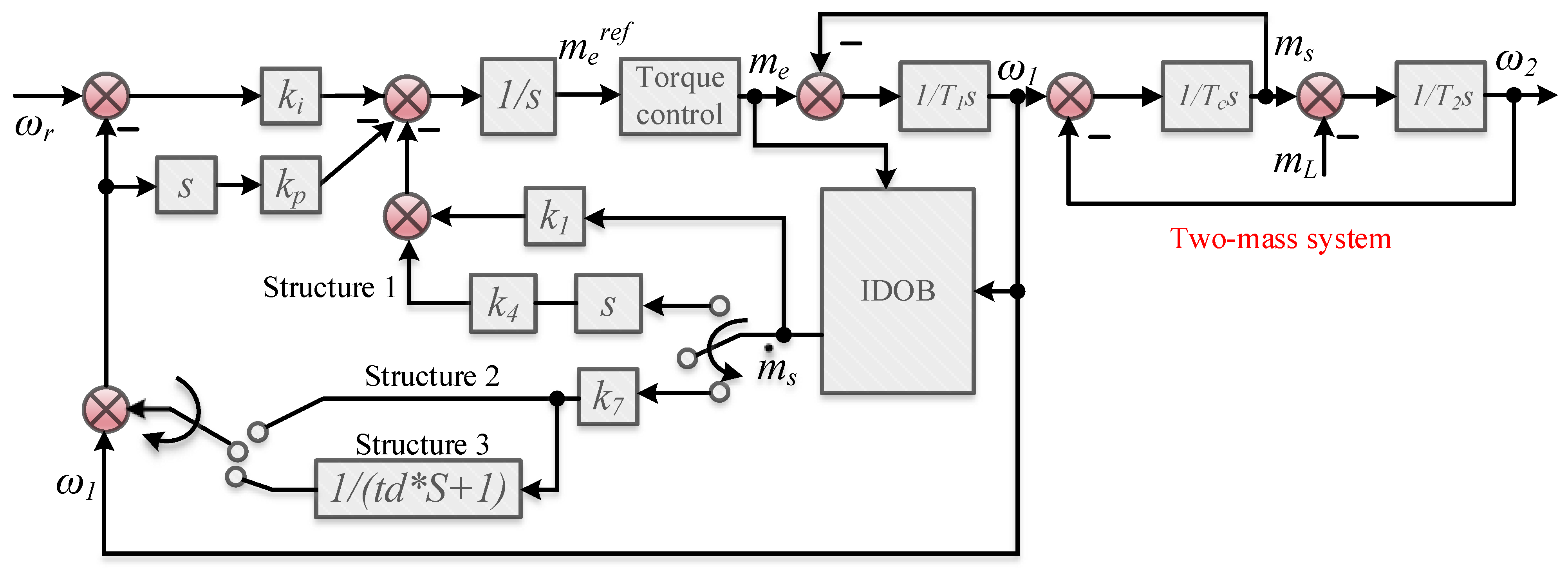 In this arrangement, the additional feedback from the first derivative of the torsional torque, with gain coefficient k7, is coupled to the speed node with a time delay. Mathematical and block diagram representations of the proposed control structures are shown in Equation (3) and Figure 4.