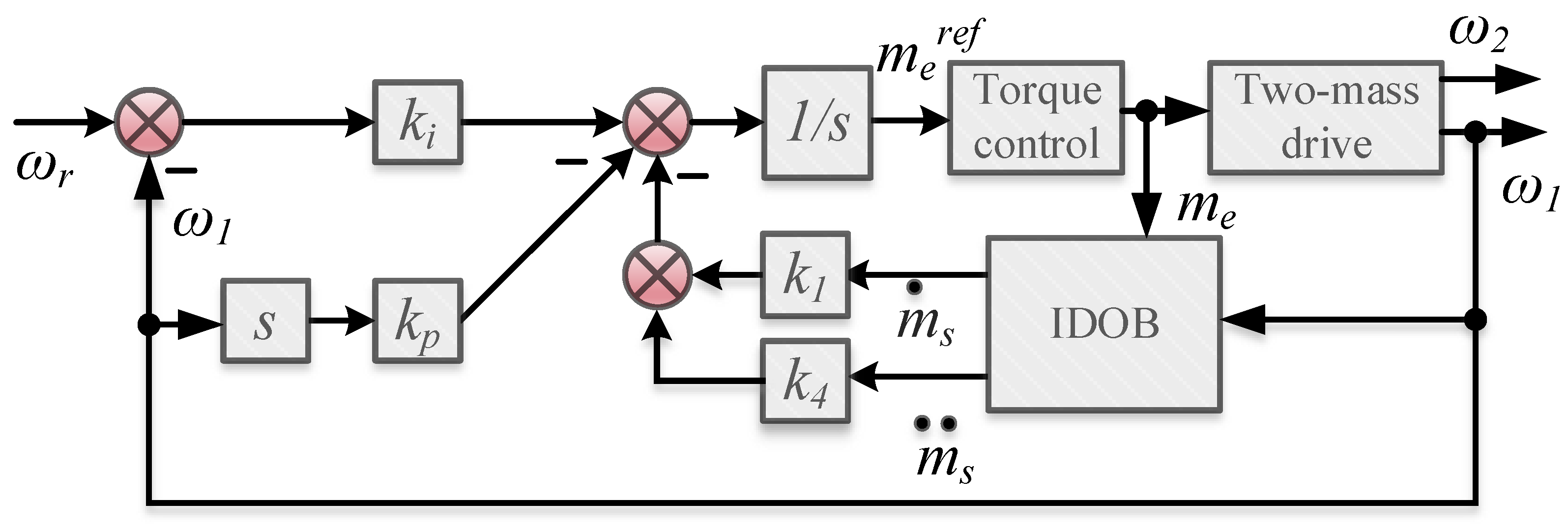 In this control structure, a PI controller with additional feedback from the first and second derivative of the torsional torque, with gain coefficients k1 and k4, respectively, is used to control meref. The design concept is based on subtracting the combined effect of the additional feedback, along with their gain coefficients, from the PI controller output. Based on the error between the reference and the motor speed, the additional feedback helps maintain an appropriate meref, ensuring a stable control system with damped oscillations. The mathematical formulation and the block diagram of the proposed control structure are presented in Equation (2) and Figure 3.
